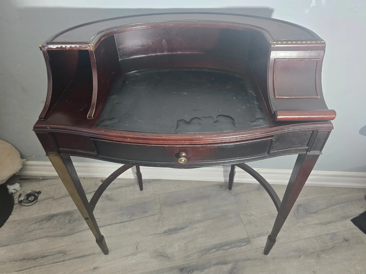 Selling an antique mahogany writing desk. It features a curved design with a black leather writing surface and a small drawer. The desk has some wear and tear, but it's still a beautiful and functional piece of furniture.