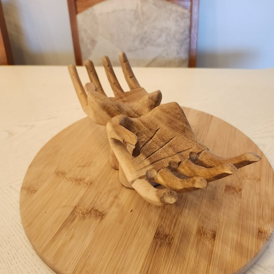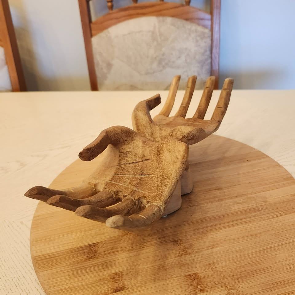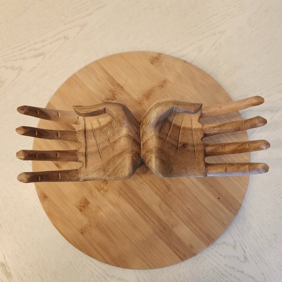 Carved out of wood with detailing of palm and finger creases, as well as fingernails!