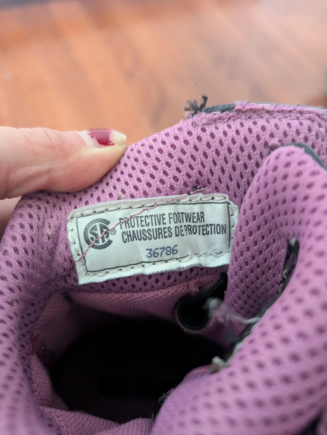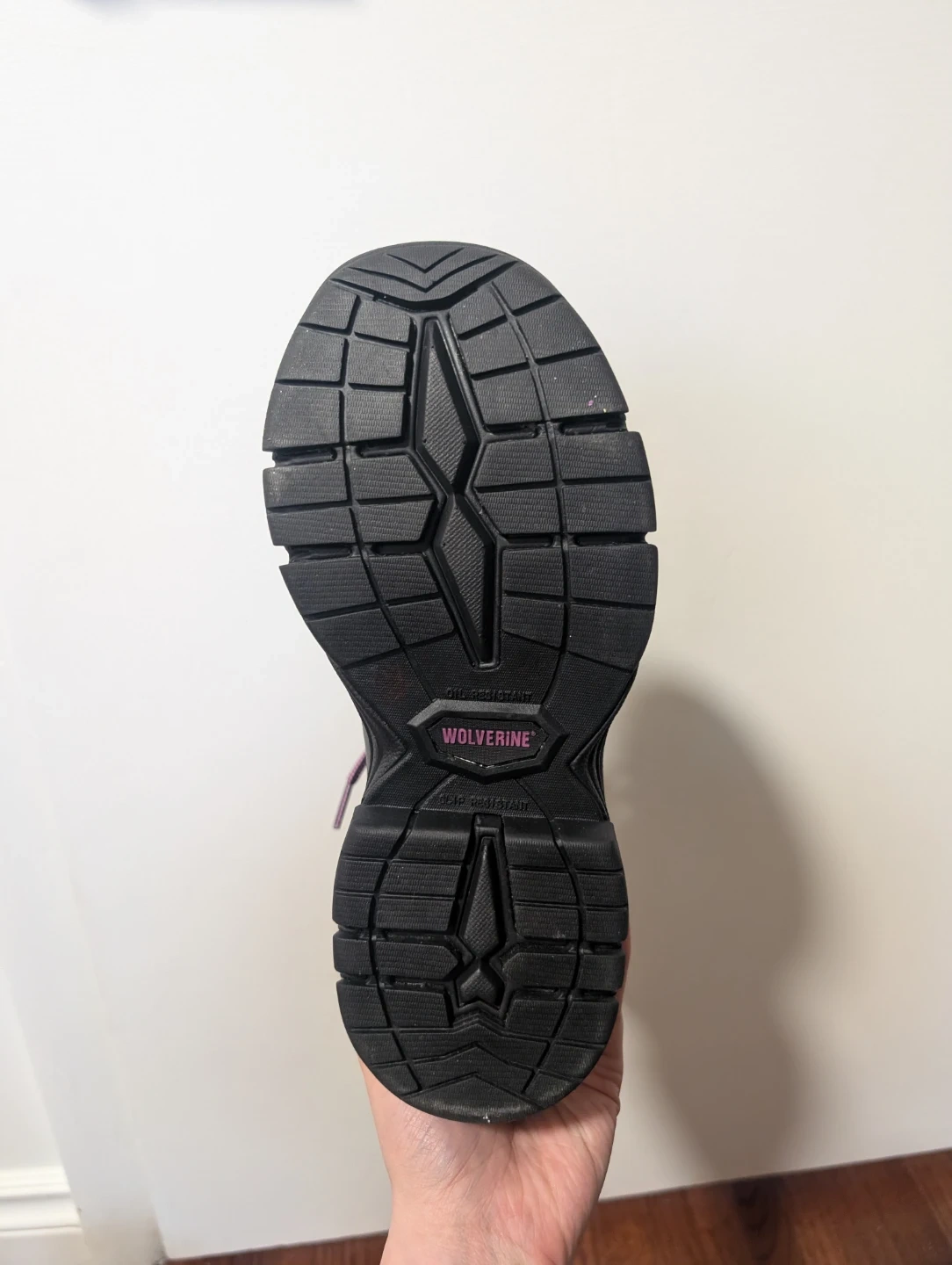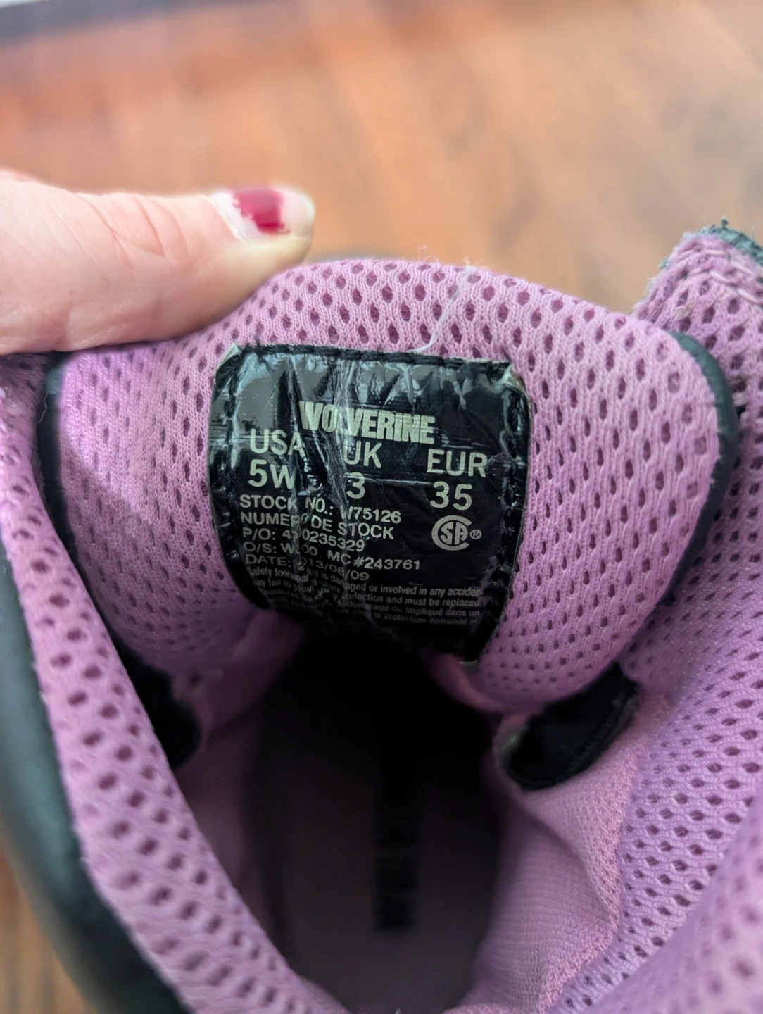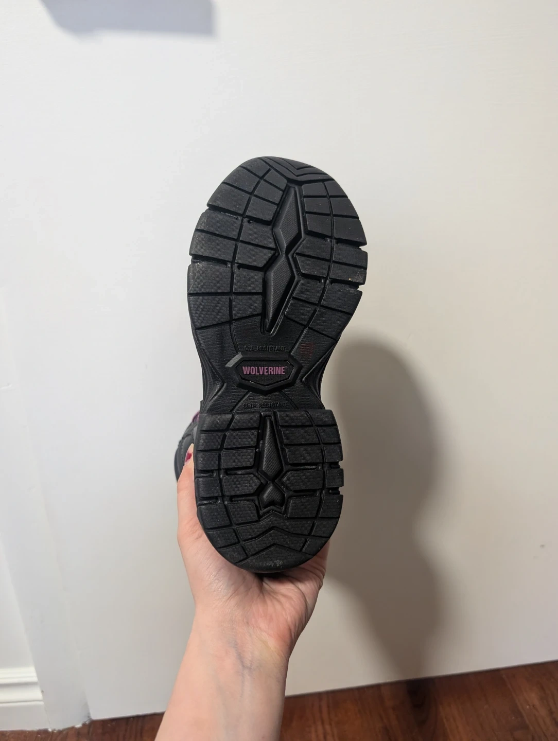 Selling a pair of Wolverine women's work boots in size 5W. They are black with purple accents. These boots have a composite safety toe and are insulated for warmth and protection on the job site!
