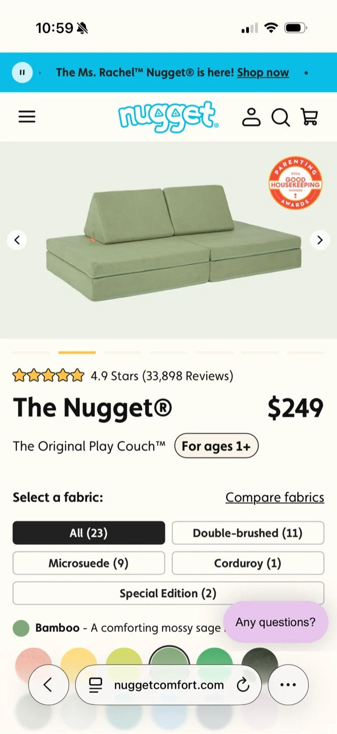 The Original Play Couch™ is great for ages 1+ and originally retails for $249. It's made with microsuede fabric and is a comforting mossy sage colour! Perfect for kids to play and relax on
