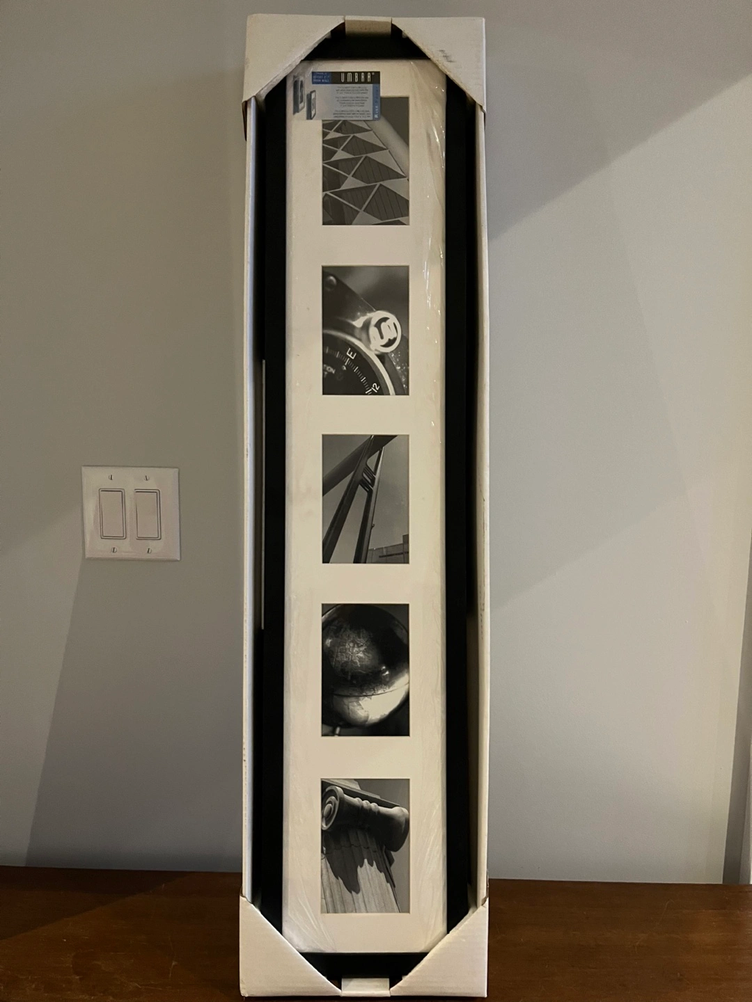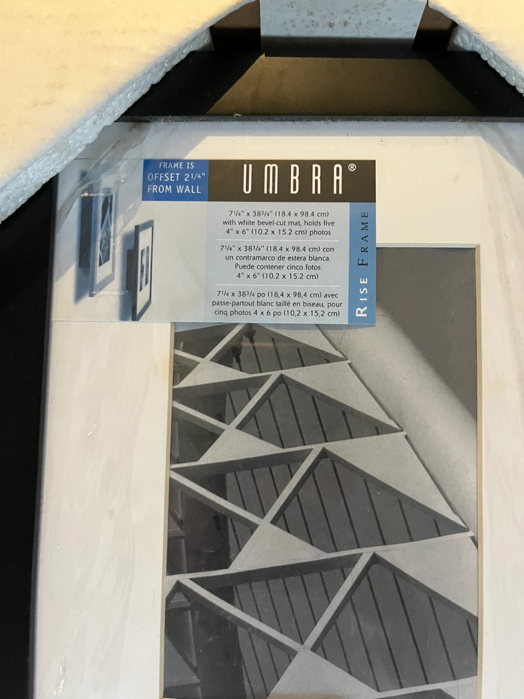 I'm selling a brand new Umbra Rise Frame, still in its original packaging! This frame is designed to hold five 4" x 6" photos with a white bevel-cut mat. It measures 7 1/4" x 38 3/4" and is offset 2 1/4" from the wall. A great way to display your favourite memories!