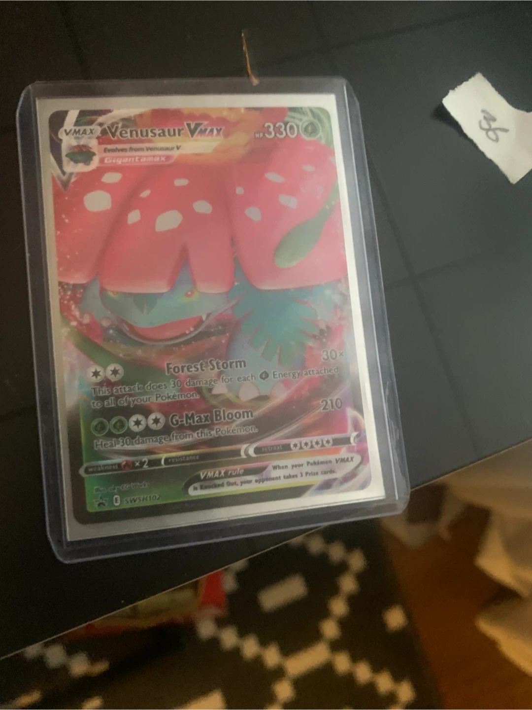 Selling a Venusaur VMAX Pokemon card. It evolves from Venusaur V and is Gigantamax. It has HP 330 and the attacks Forest Storm and G-Max Bloom. The card number is SWSH102