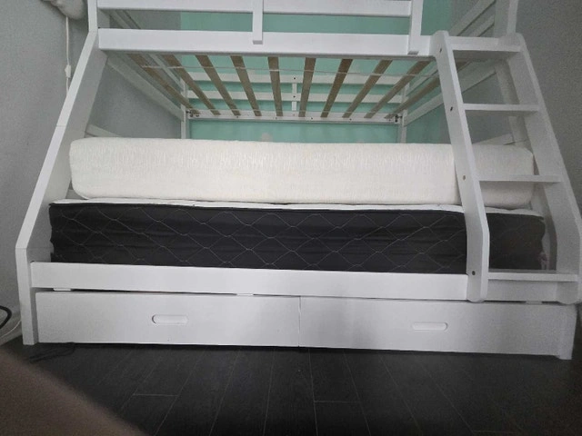 This modern white bunk bed is perfect for kids and teens, offering a stylish and space-saving sleeping solution. This bed is in used condition, but is in perfect state of usage. It features a sturdy frame, a built-in ladder for easy access to the top bunk, and a clean white finish that complements any room decor. The bunk bed also includes storage drawers underneath, providing extra space for organizing belongings such as clothing. * Sturdy construction * Built-in ladder * Storage drawers included * Includes 2 Comfy Materesses