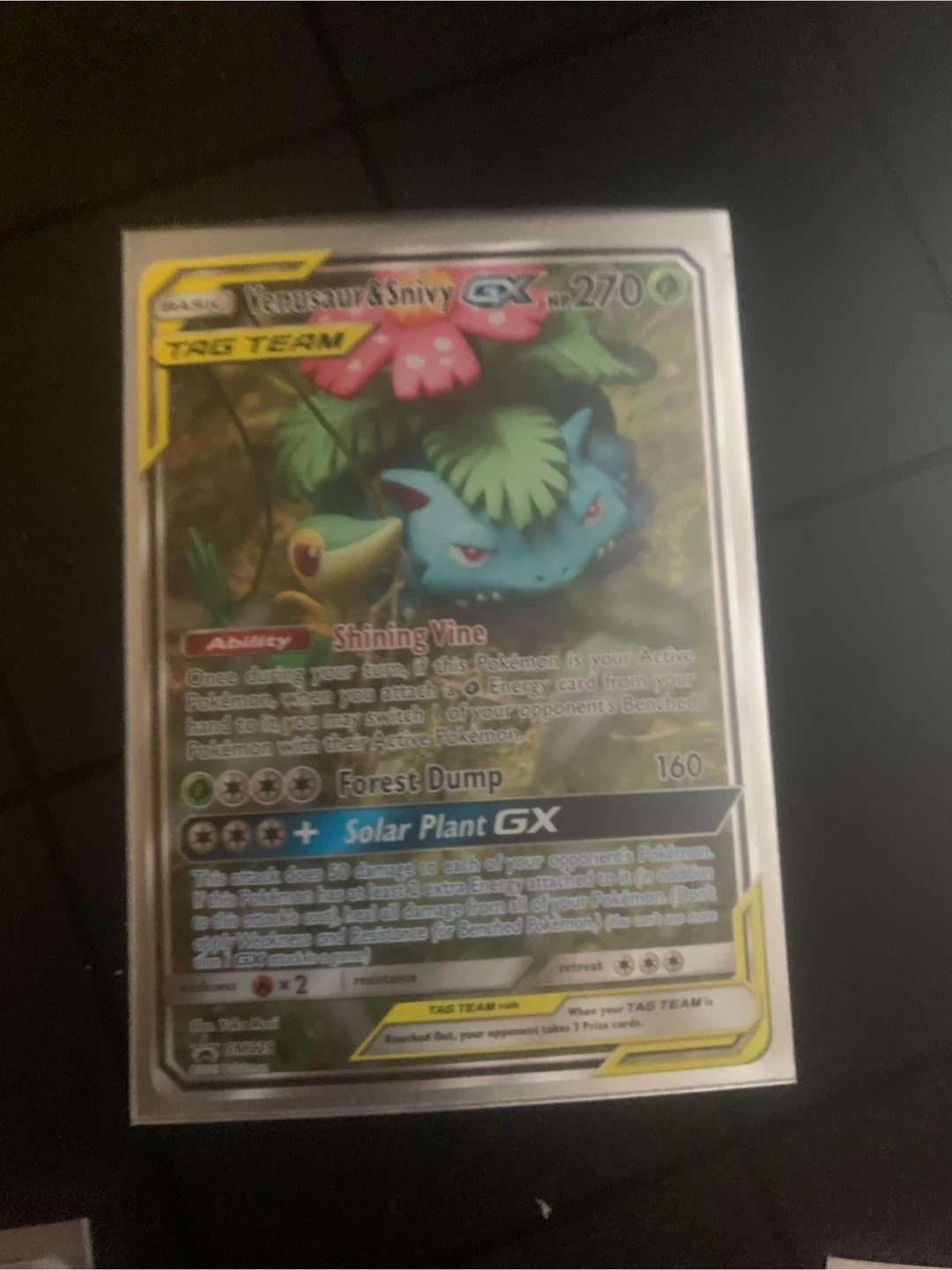 Selling a Venusaur & Snivy GX Tag Team Pokemon card. It has an ability called Shining Vine. It also has attacks like Forest Dump and Solar Plant GX