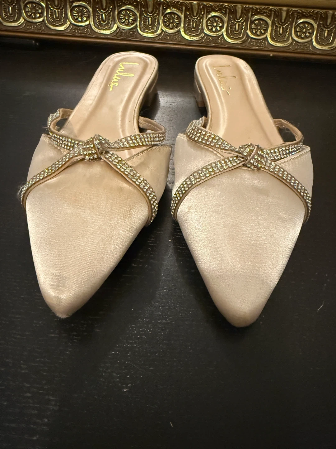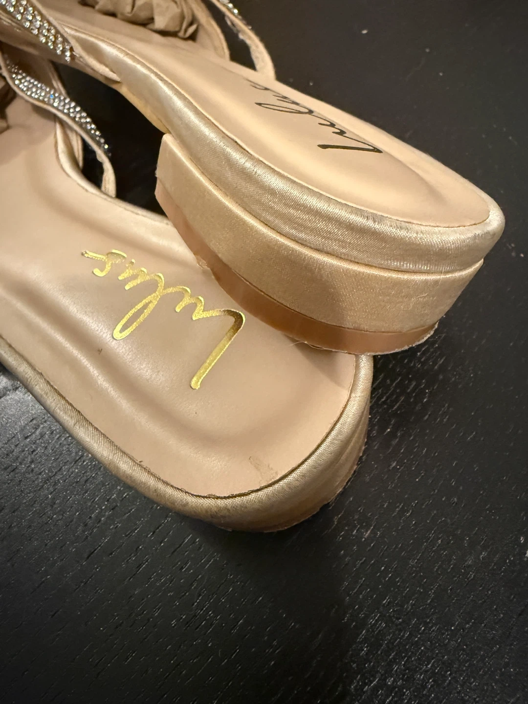 Selling a pair of Lulus gold heels in size 8.5.They are in great condition and ready for a new owner. The heels feature a stylish design with a touch of sparkle, perfect for dressing up any outfit. They are comfortable and easy to wear.
