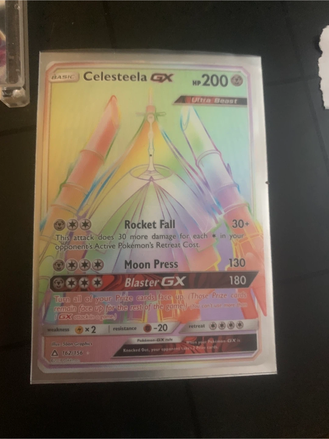 Selling a Celesteela GX Pokemon card. It has a HP of 200 and features the attack Rocket Fall which does 30 more damage for each in your opponent's Active Pokémon's Retreat Cost. It also has the attack Moon Press and Blaster GX.