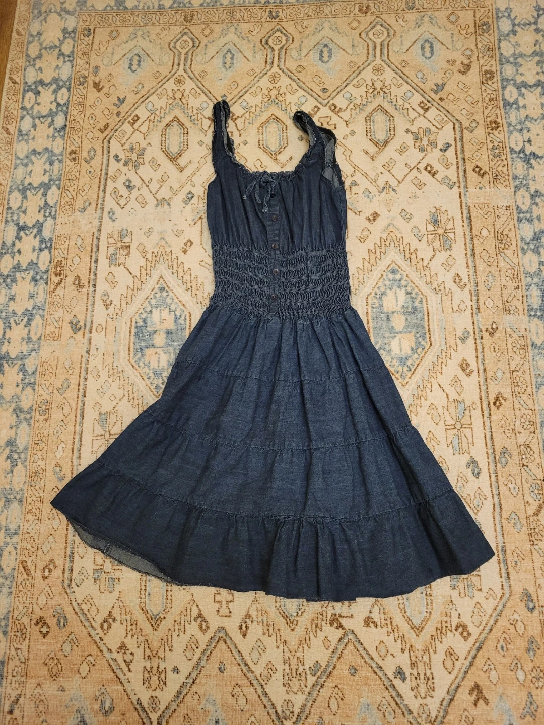 Here's a cute denim sundress! It's a size small and features a tiered skirt and shirred bodice. Perfect for a casual summer day!