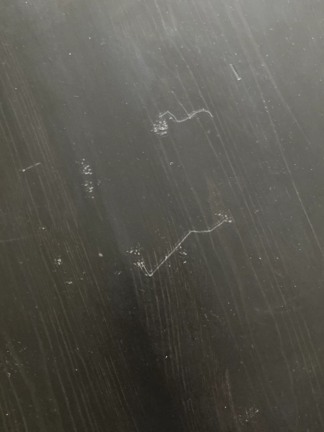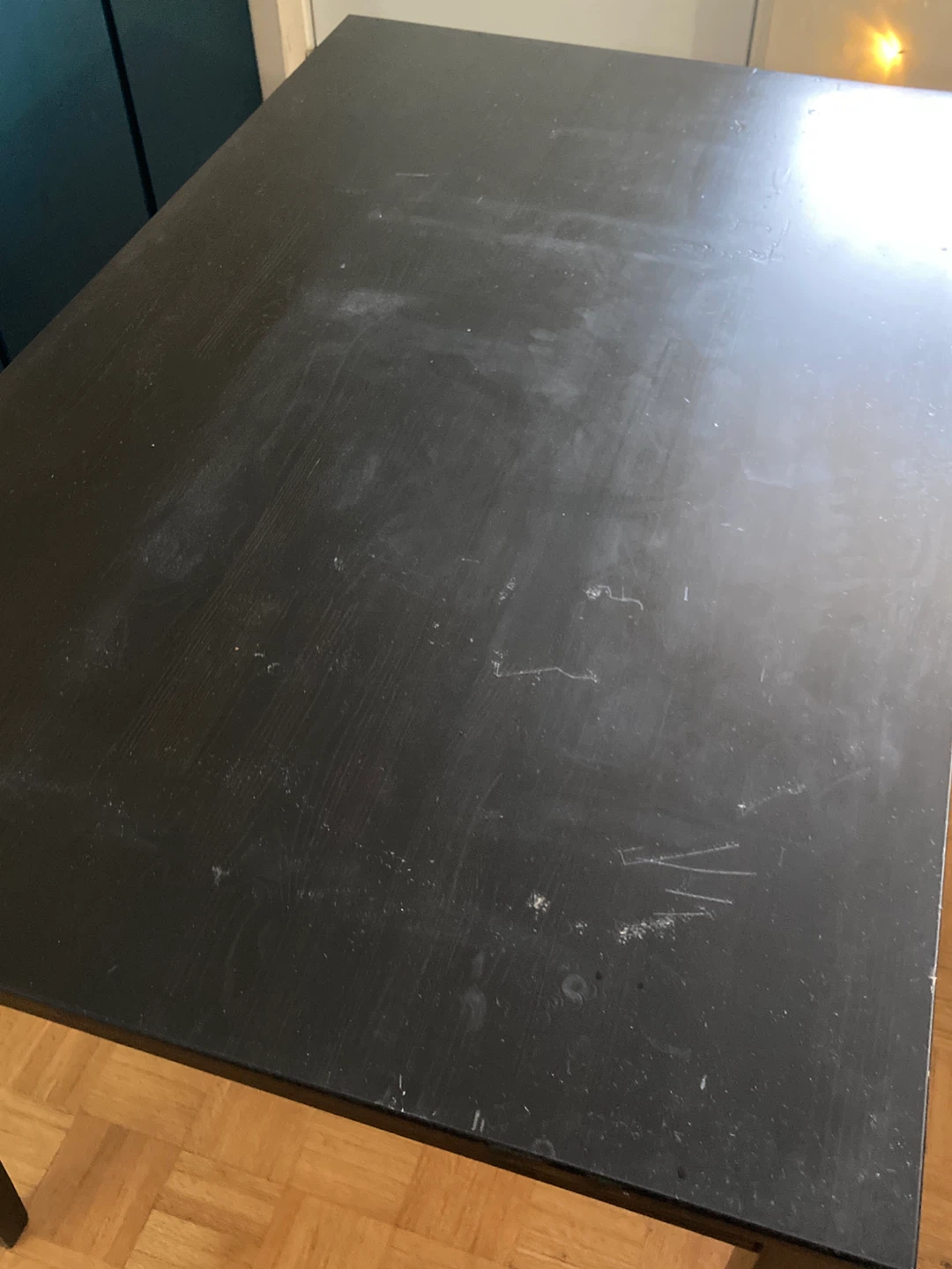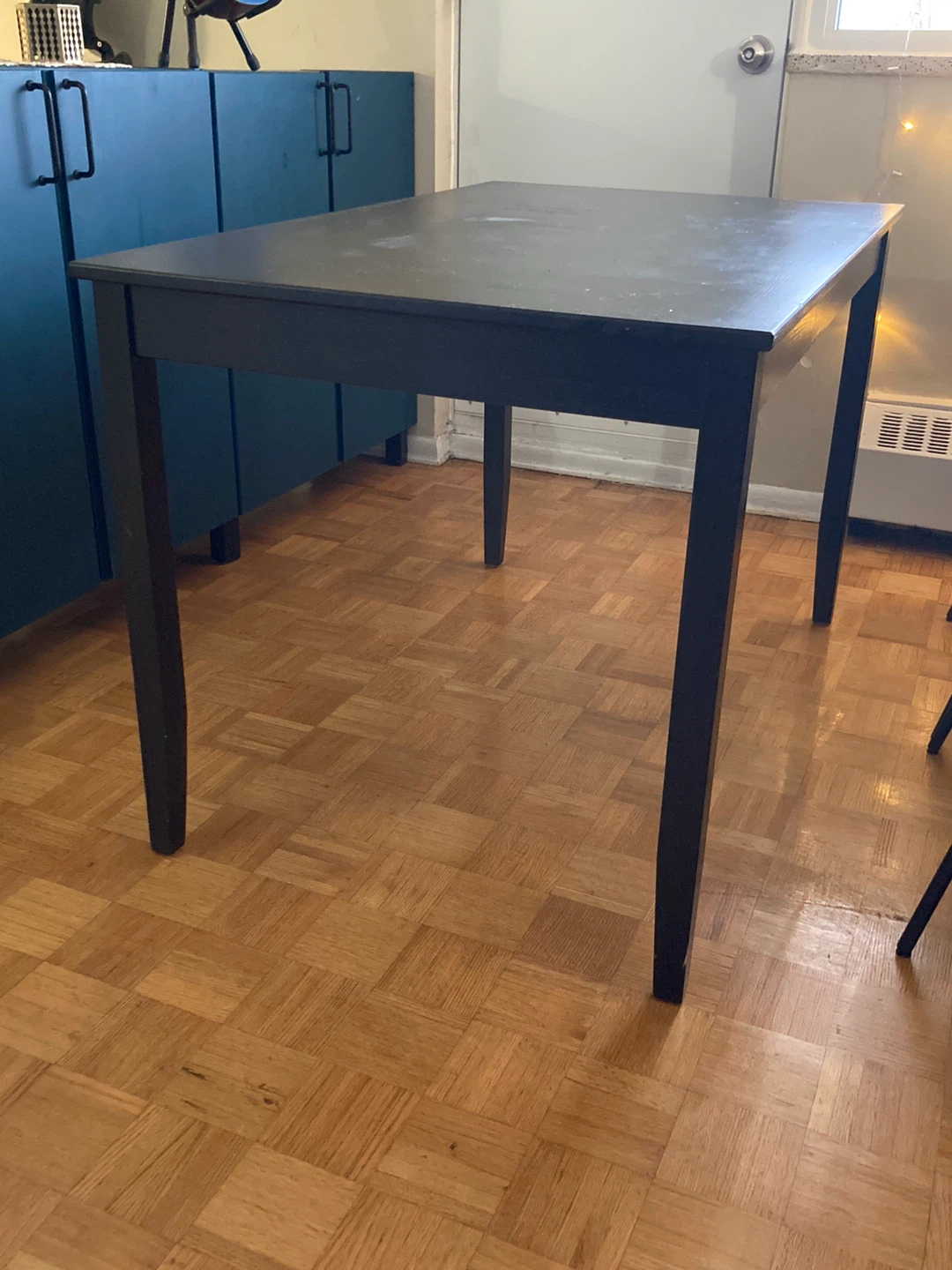 The tabletop has numerous scratches, but it remains sturdy and hasn't wobbled or broken. Looking for someone to take it without disassembling the table.
