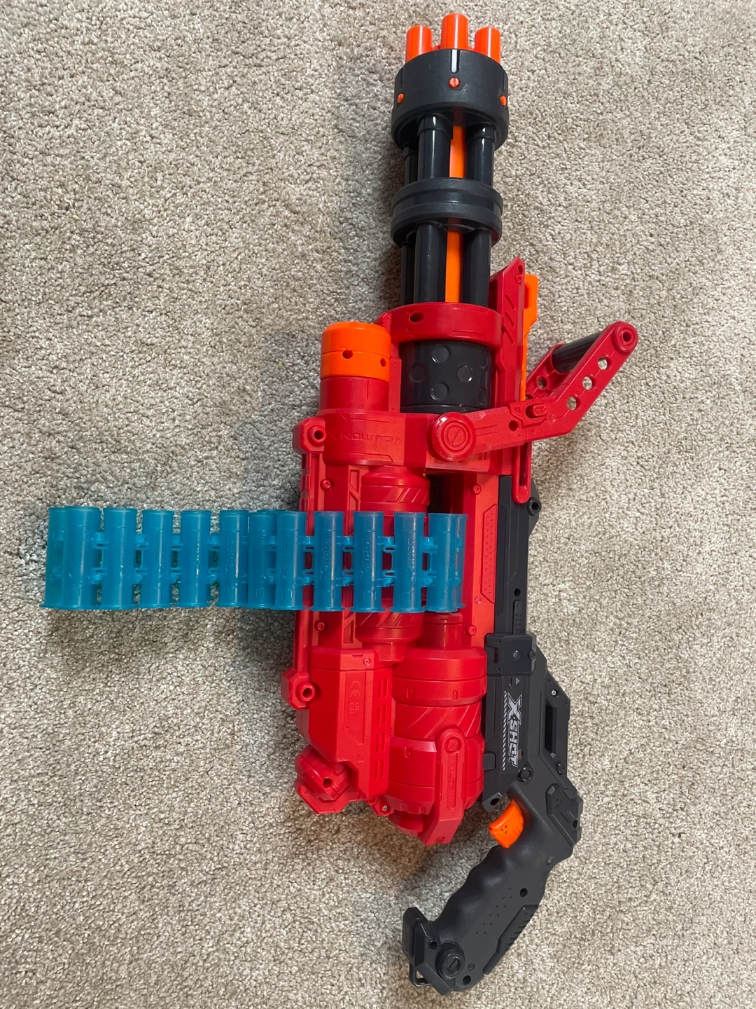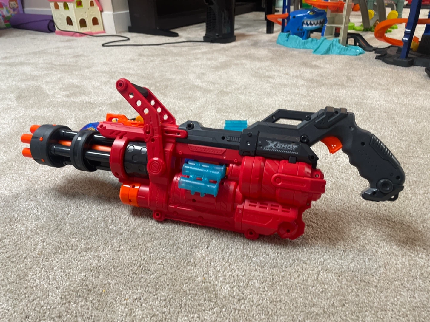 Selling an X-Shot Excel Crusher toy blaster! It's in great shape and ready for some action-packed fun. The blaster is red, black, and orange, and comes with a blue belt for holding darts. Perfect for kids and adults alike!