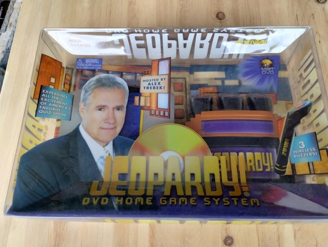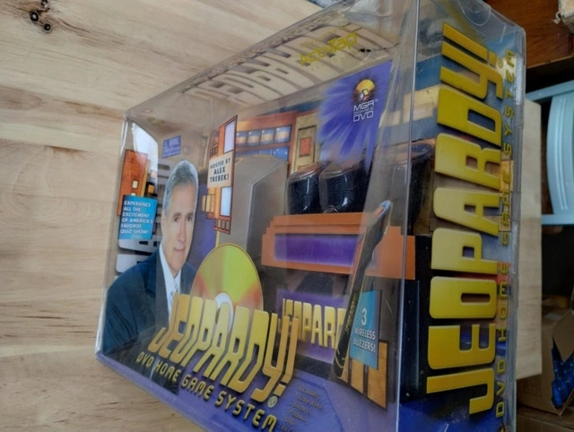 MGA Vintage Jeopardy DVD Home Game Wireless Buzzers hosted by Alex Trebek BNIB Includes DVD game system, DVD, IR set-top transmitter, DVD control wire, podium with 3 buzzers Easy visual setup guide for system and buzzers. Easy to see scoring 20 original episodes featuring more than 1,200 clues Famous quiz show game system with hand-held buzzers Daily doubles and Final jeopardy