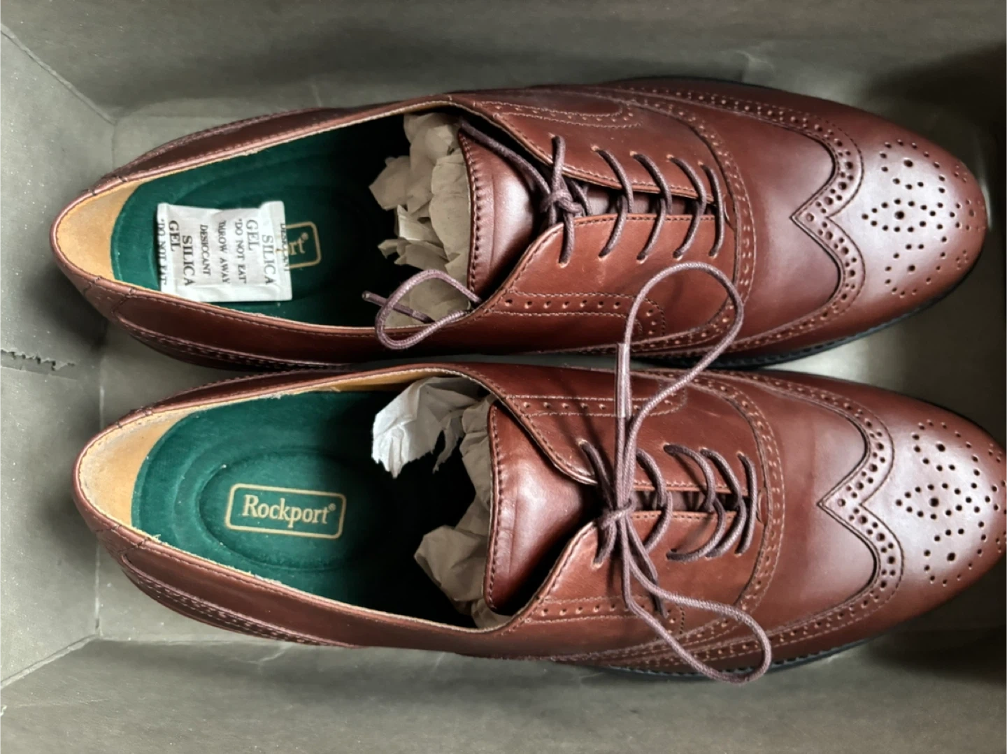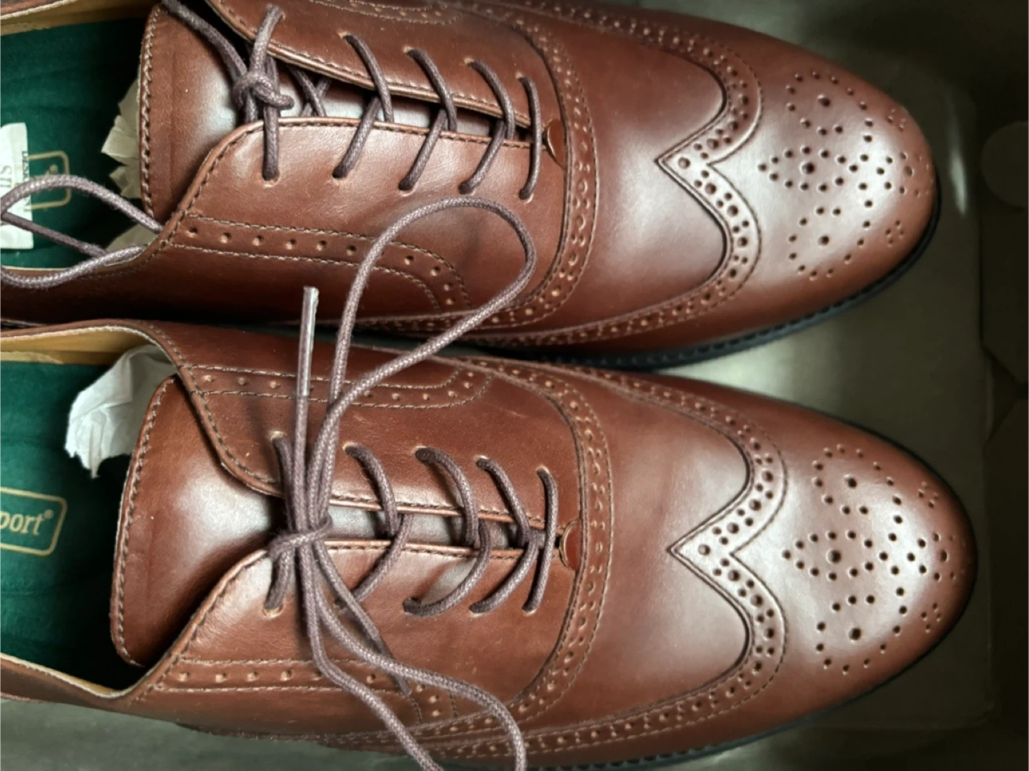 Rockport wingtip dress shoes in a dark brown colour. These are a size 12 and never been worn