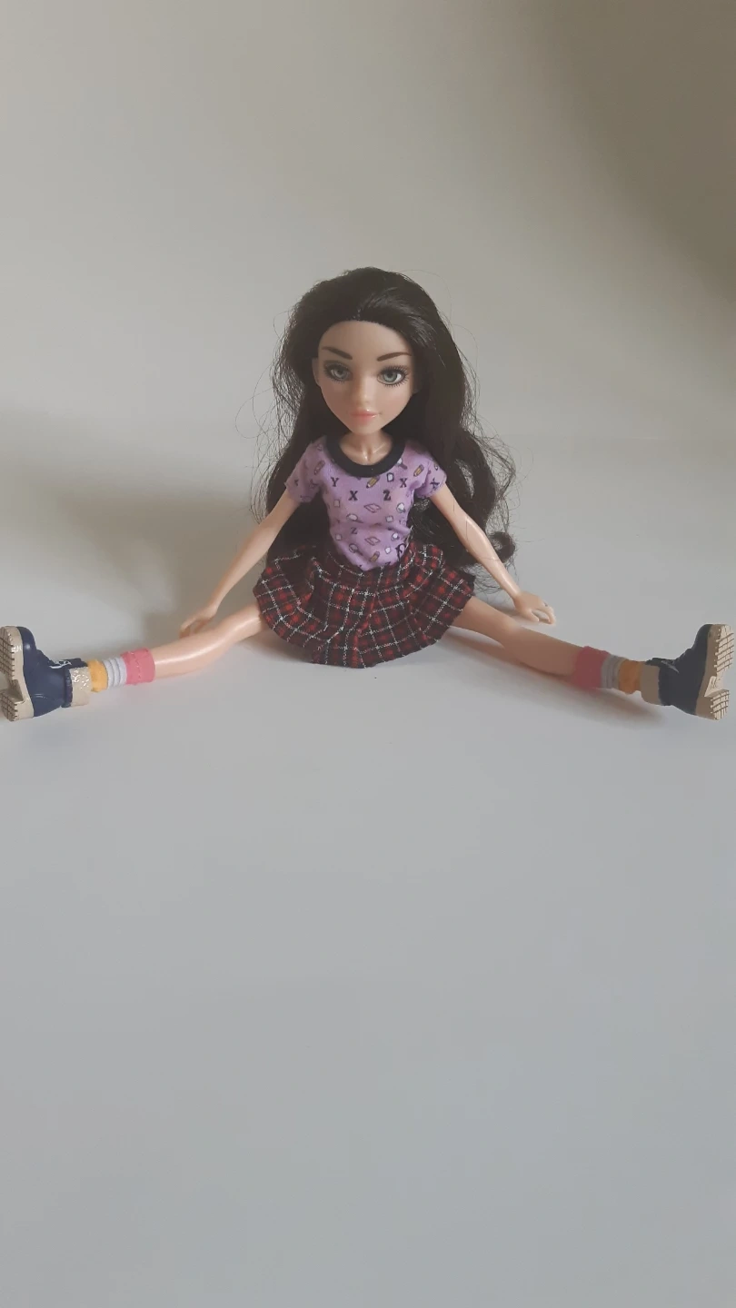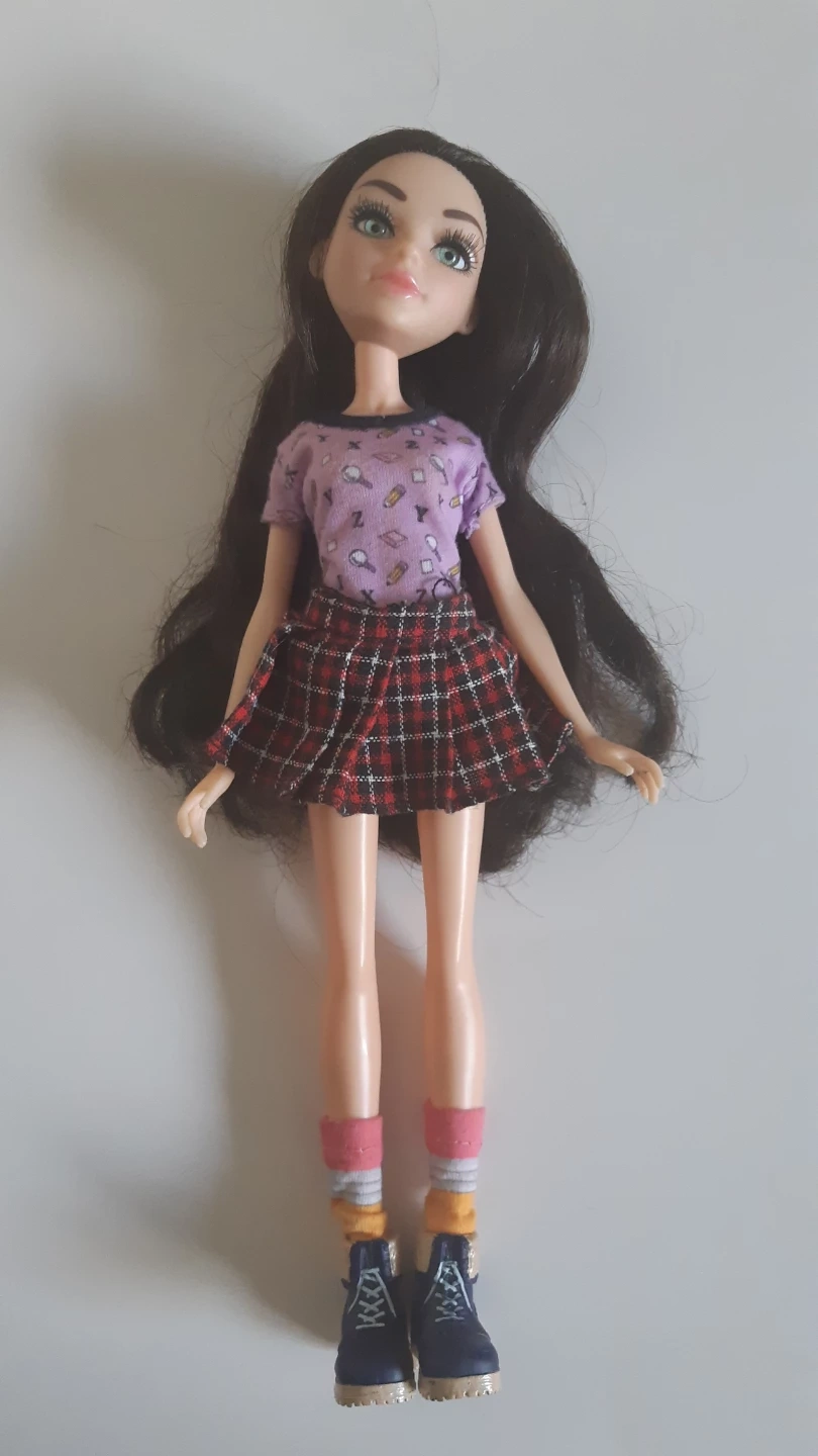 Here's a doll with long dark hair, wearing a purple t-shirt and a red plaid skirt with pencil socks!! It's in good condition and ready for a new home.