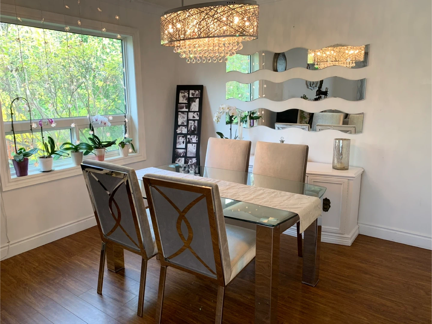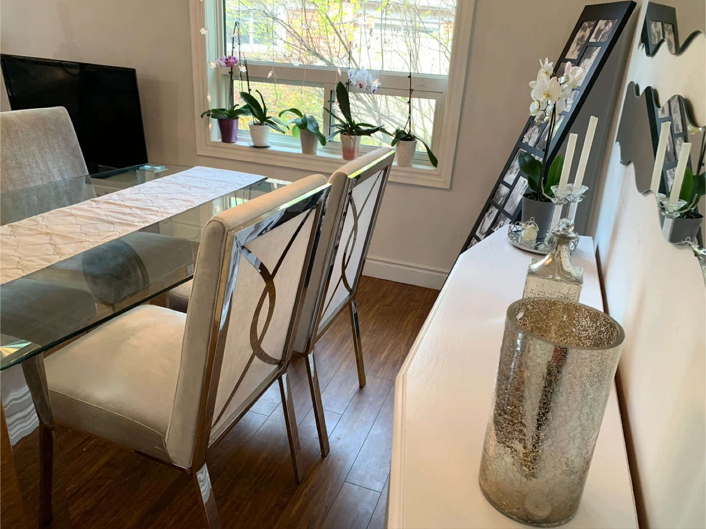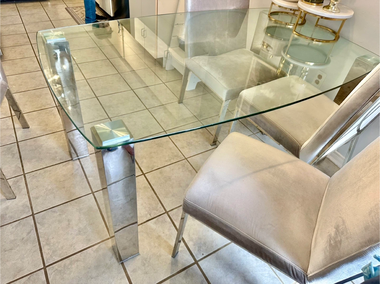 Selling a 63 inches glass dining table with four chairs! The table has a clear glass top and chrome legs. The chairs are upholstered in a light beige fabric with a chrome frame. It's perfect for a modern dining space!