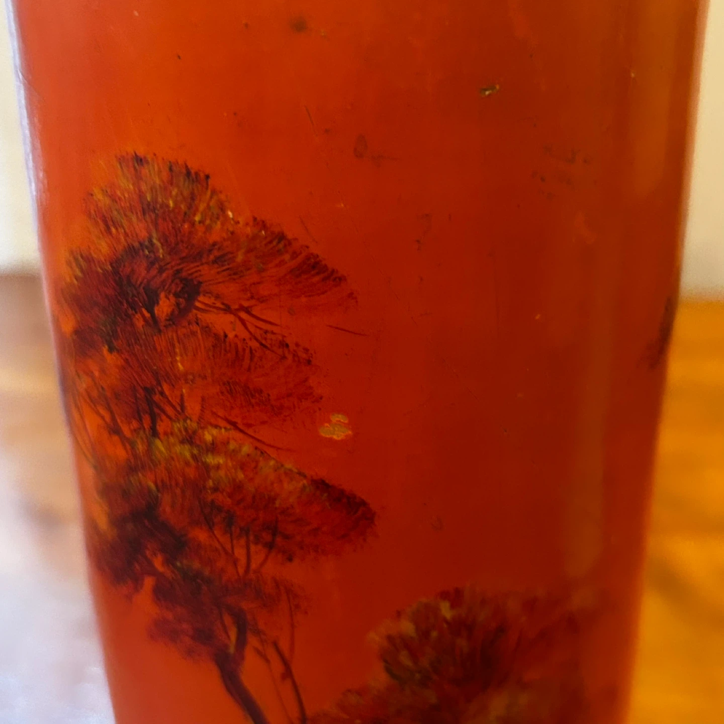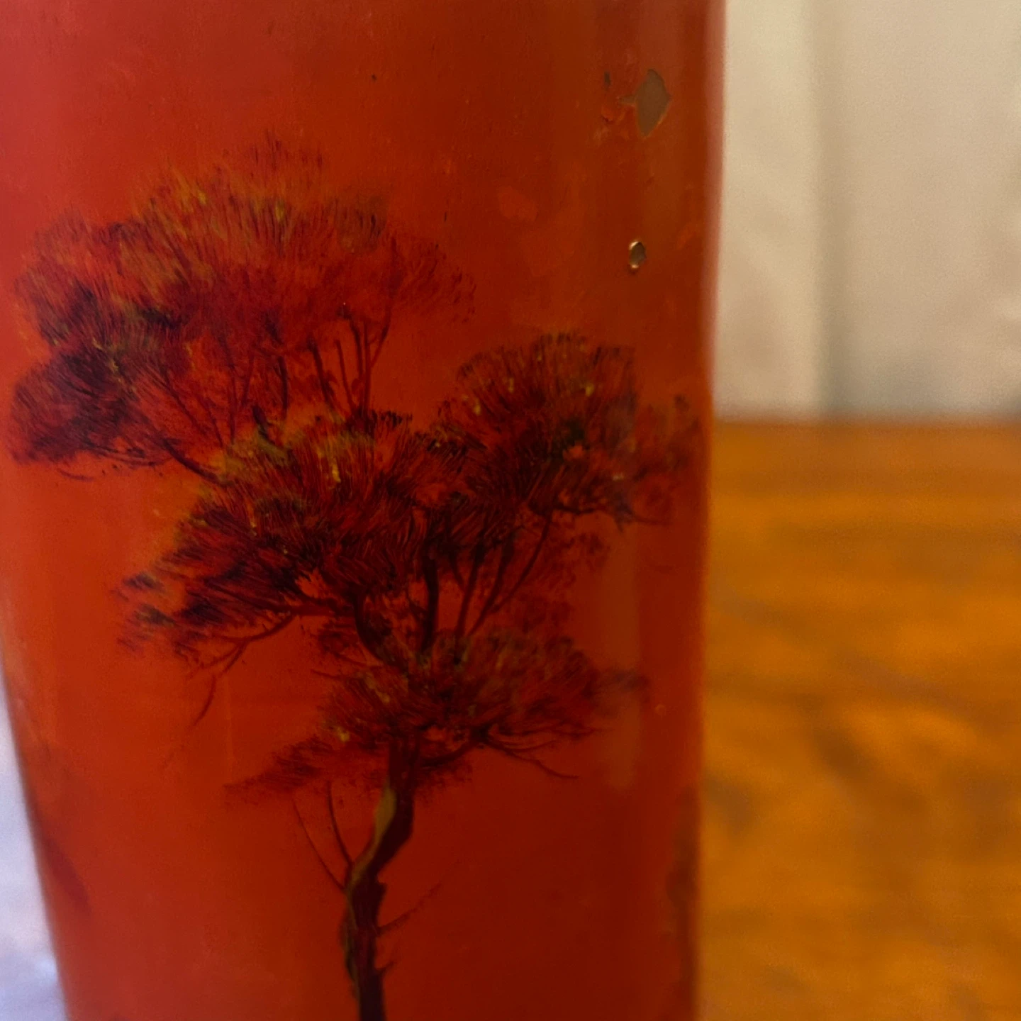 Striking cylindrical vase featuring a detailed landscape scene with trees and rocky terrain, rendered in rich red, rust, and earth tones. The artwork wraps around the body, giving it a strong visual presence from every angle. Tall, slim profile makes it ideal for branches, stems, or as a standalone decorative piece.