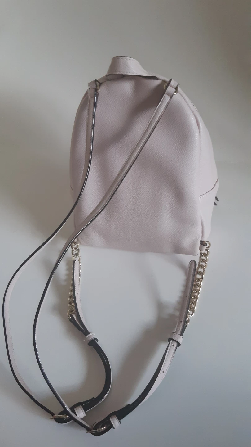 This is a cute pink backpack from Victoria's Secret. It has a chevron pattern on the front and gold chain details on the straps. The interior is black.
