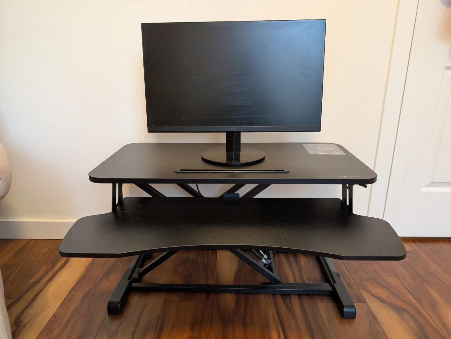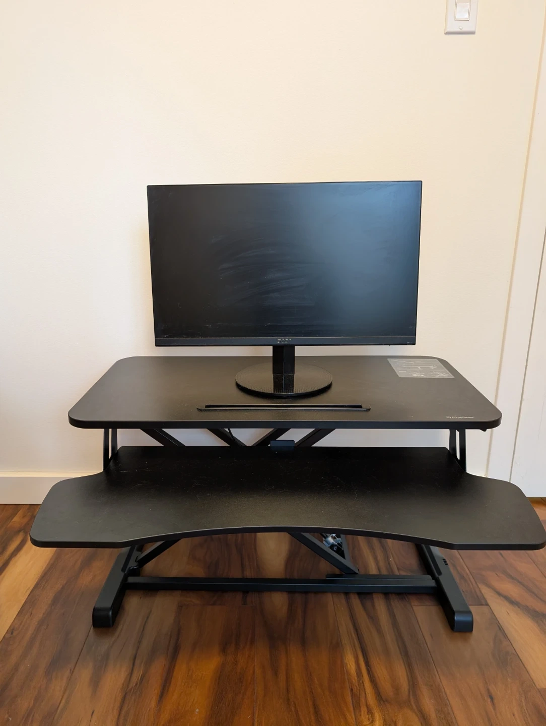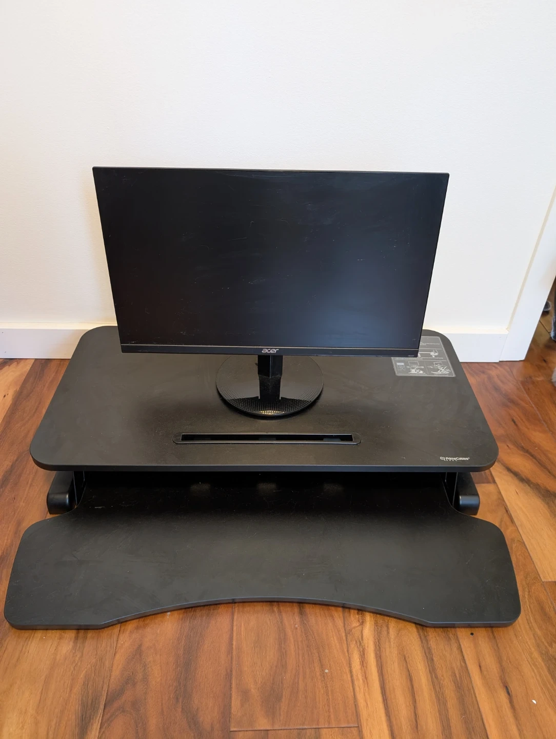 Selling an Ergonomic sit-stand desk converter in black. Like new condition and ready for a new workspace. Comes with a free 24 inch working monitor. This desk converter lets you easily switch between sitting and standing throughout the day. It's a fantastic way to add some movement to your workday!