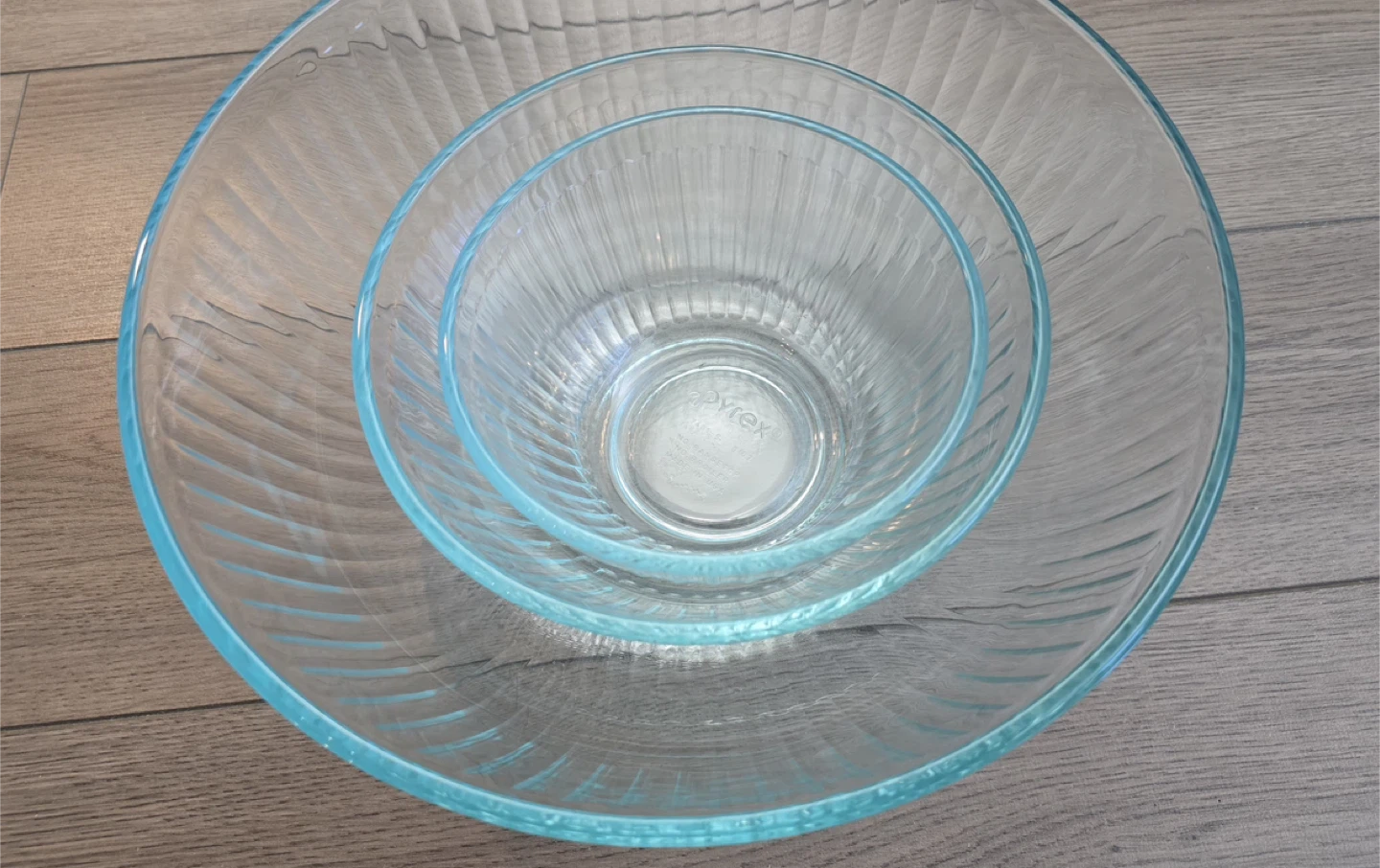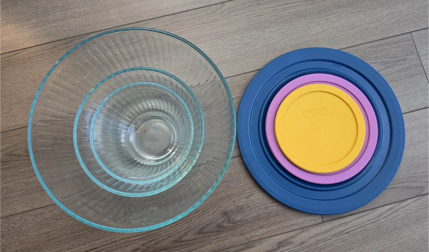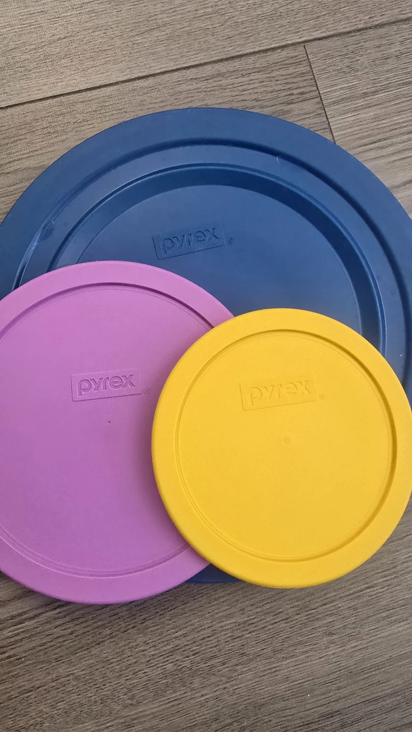 Selling a Pyrex mixing bowl set that includes three glass bowls and three lids. The lids are in blue, purple, and yellow.