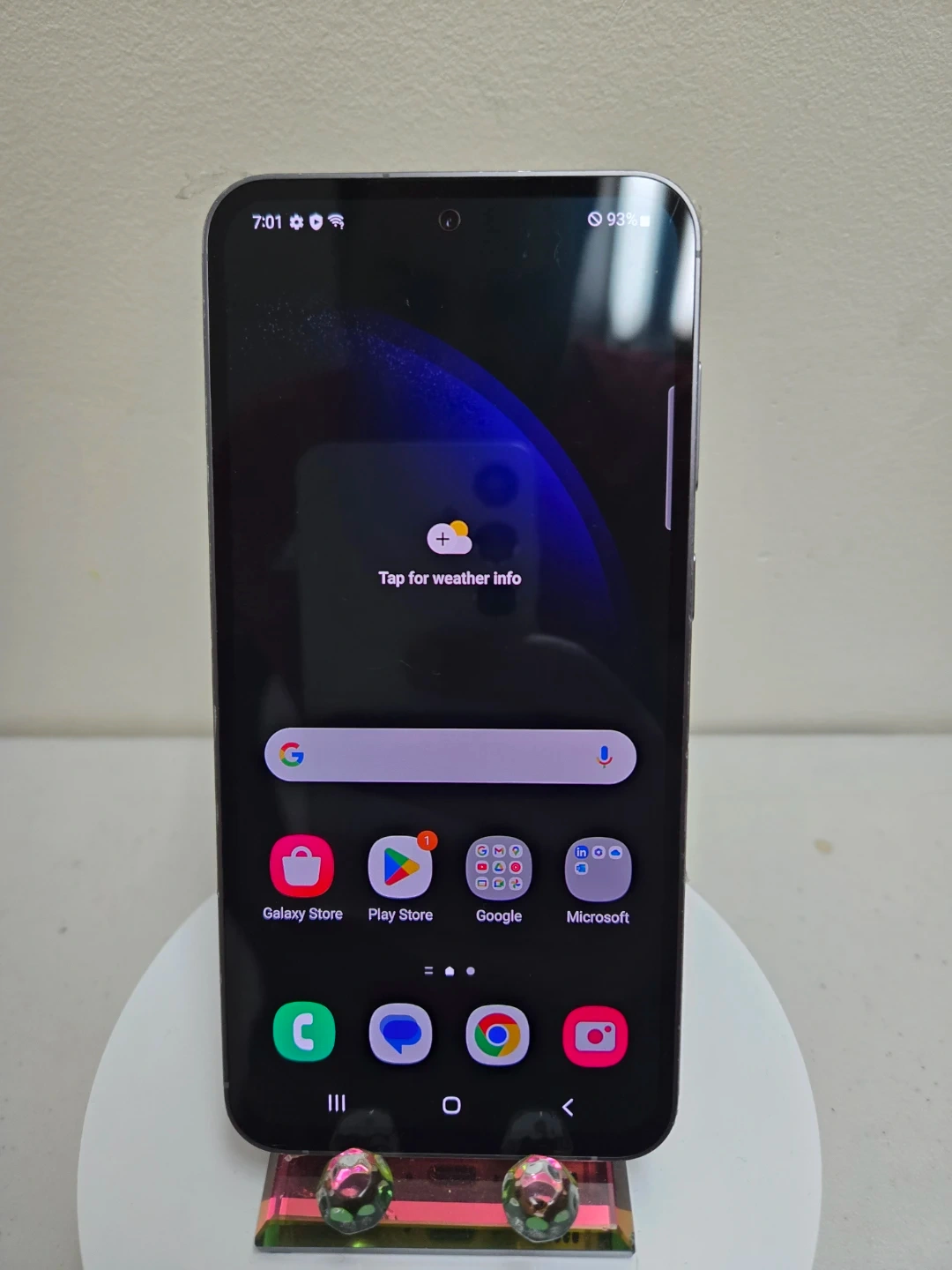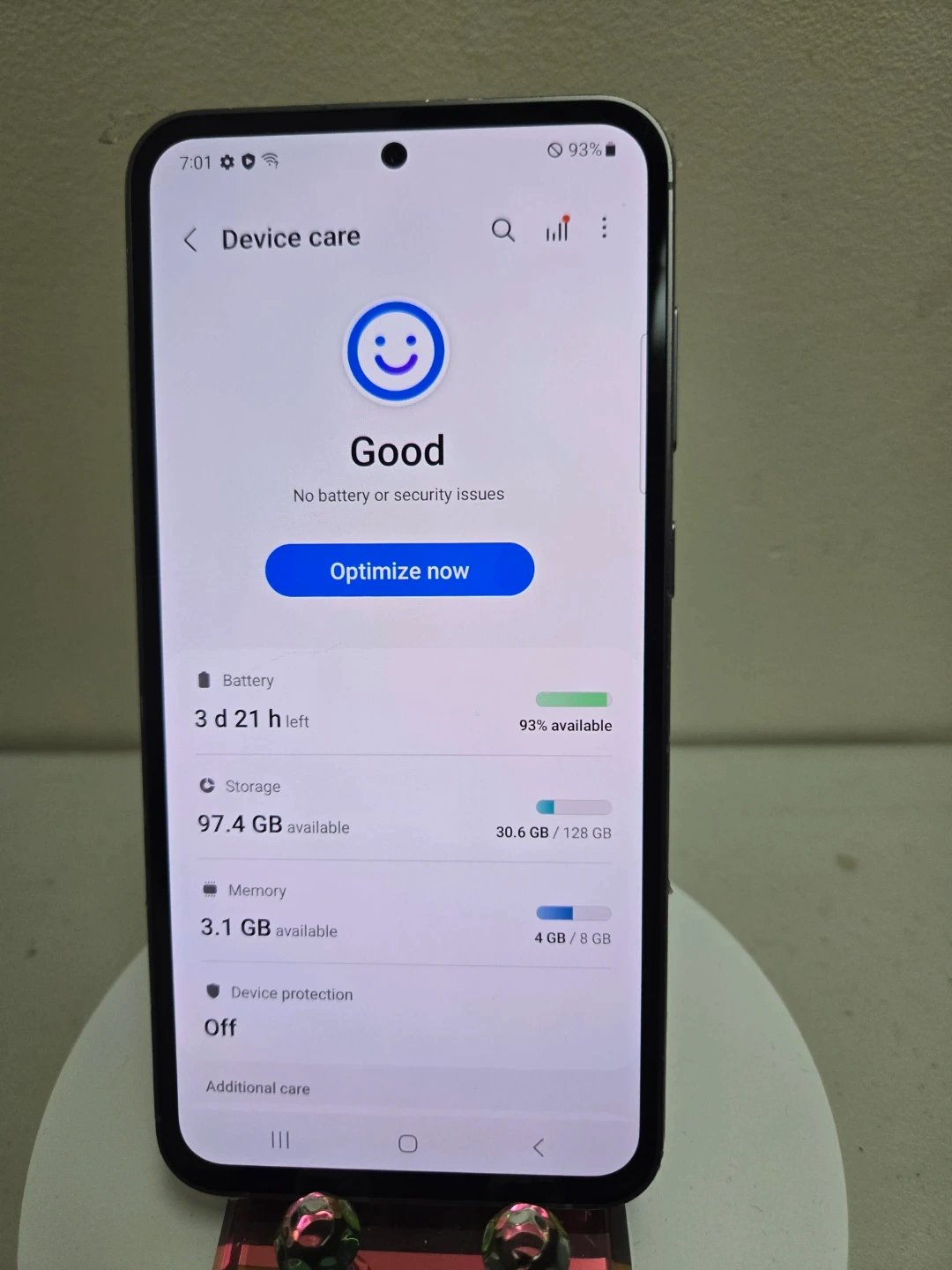 Selling a Samsung Galaxy S23 in black with 128GB of storage. The phone is in excellent condition with no battery or security issues. Storage available is 97.4 GB out of 128 GB. It also has 3.1 GB of memory available out of 8 GB.