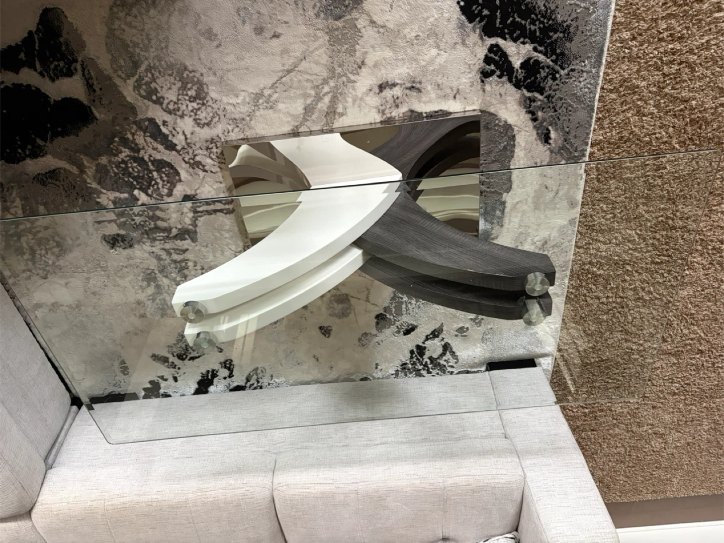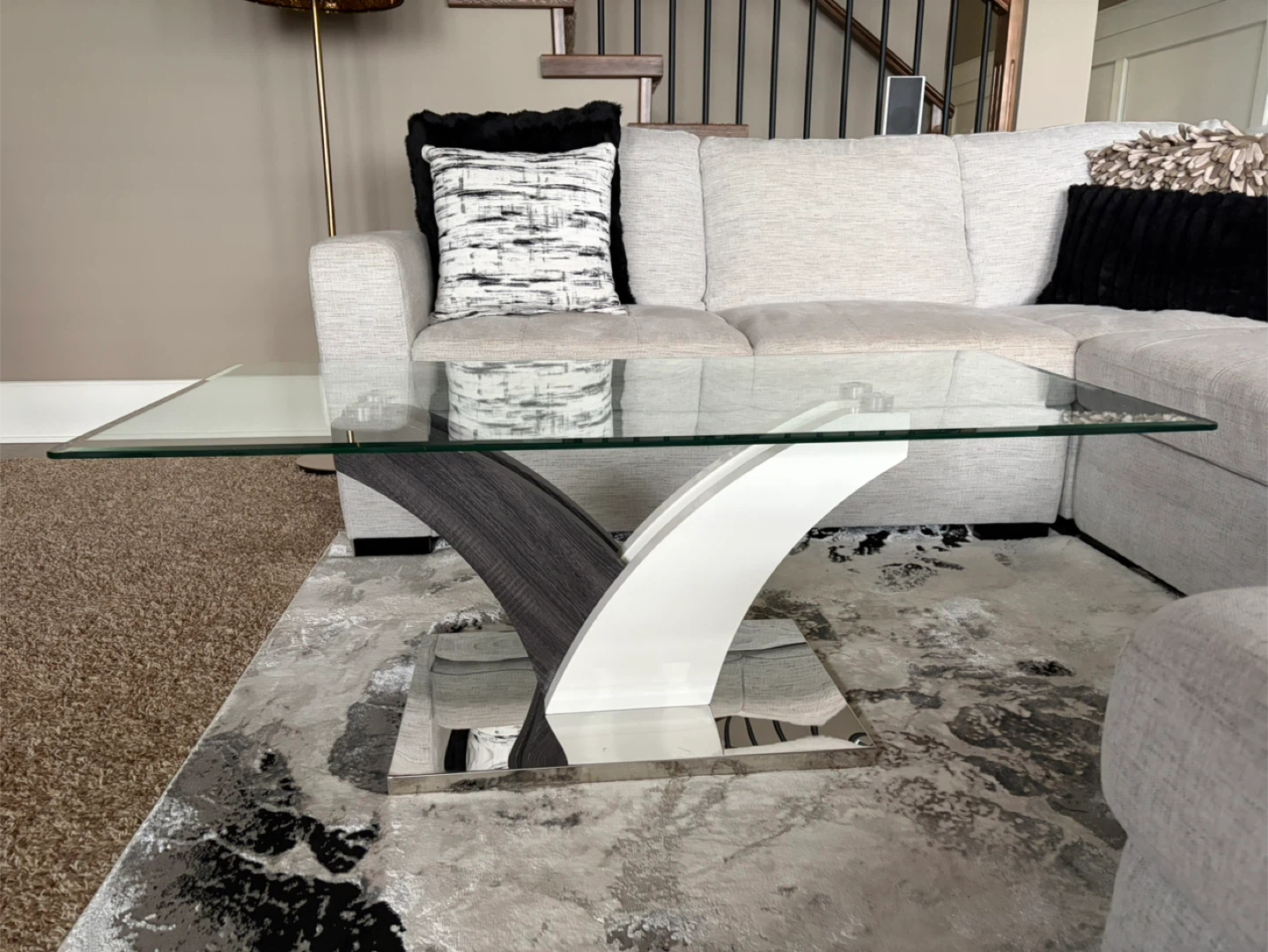 Selling a modern glass top coffee table. The base features a unique design with white and grey curved supports on a chrome base. It's in great condition and would make a stylish addition to any living room!