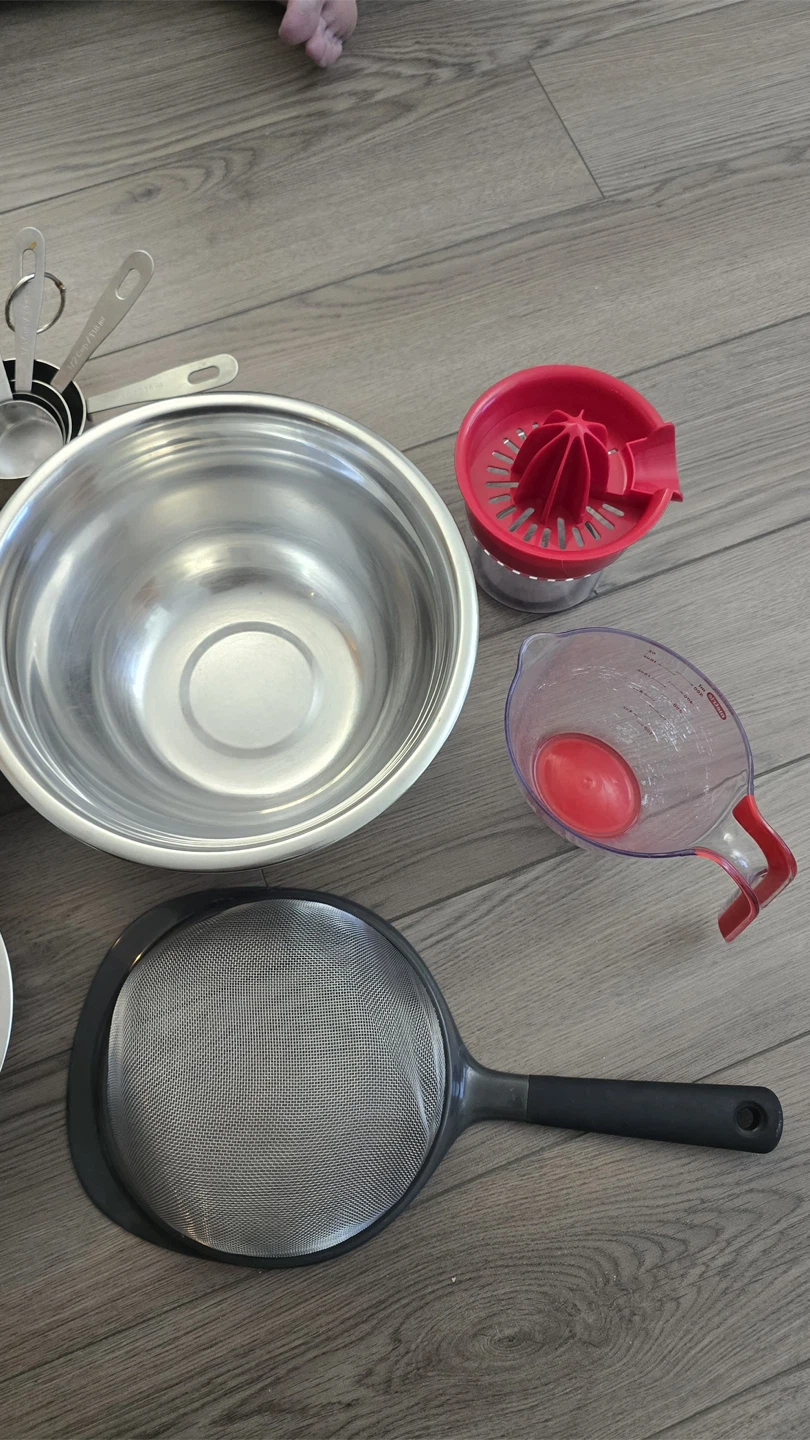Set of stainless steel bowls, Pyrex measuring glass container, juicer, measuring cup, and more.