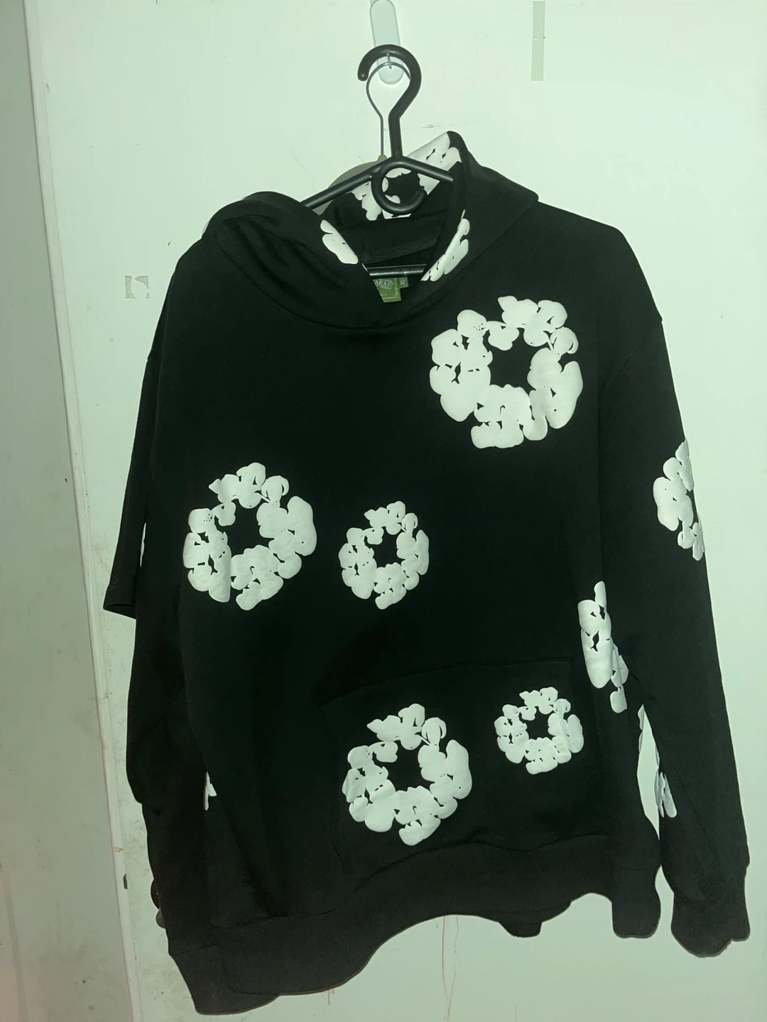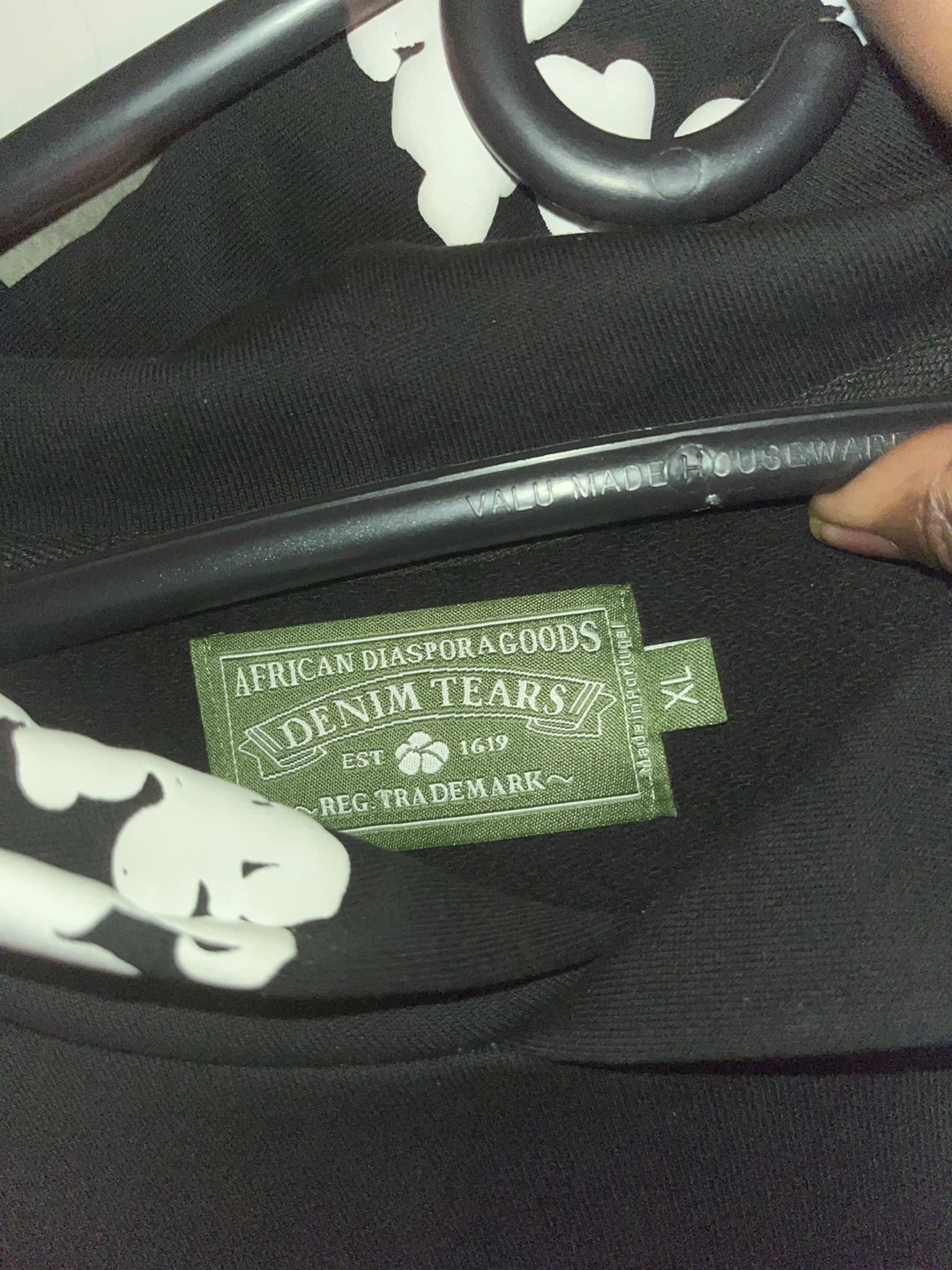Selling a Denim Tears hoodie in size XL! It's black with a white floral design. The tag indicates it's made in Portugal. Feel free to reach out if you're interested!