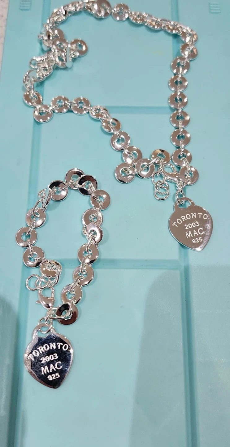 Selling a matching bracelet and necklace set in silver. Both pieces feature a heart charm engraved with 'Toronto 2003 MAC 925 plated They're in great condition and would make a lovely addition to any jewelry collection! Take all $5 each