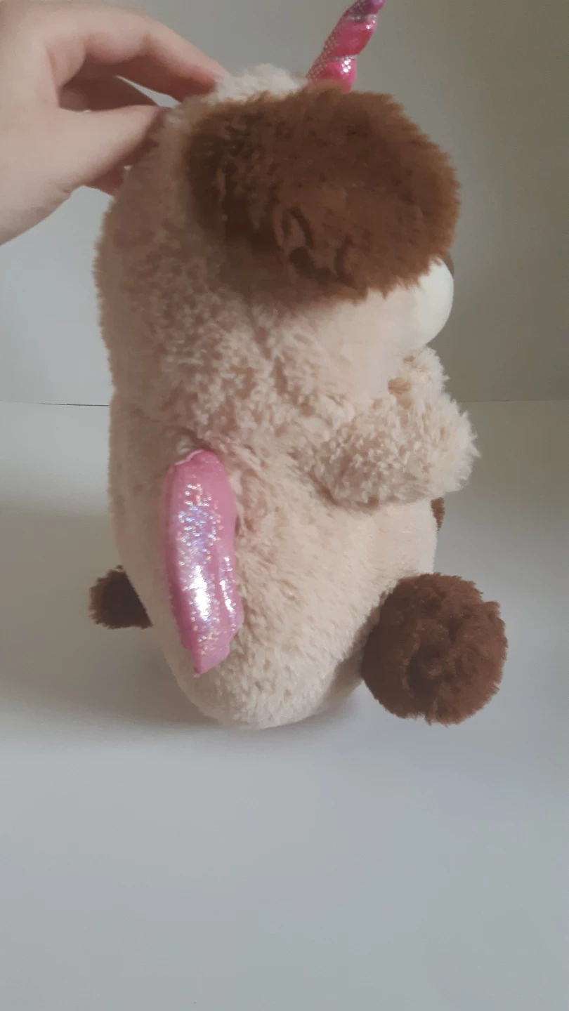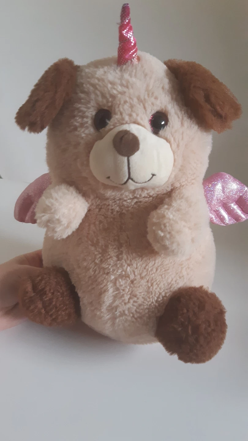 A cute and cuddly plush toy that is a mix of a dog and a unicorn! It has a soft, beige body, brown ears and paws, and a sparkly pink horn and wings. Perfect for snuggling or as a fun addition to a collection