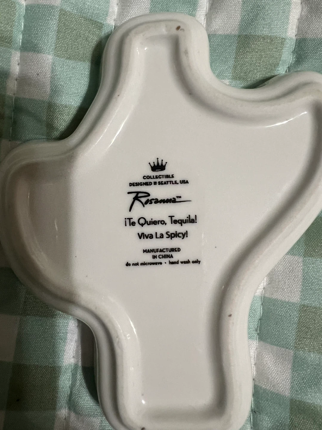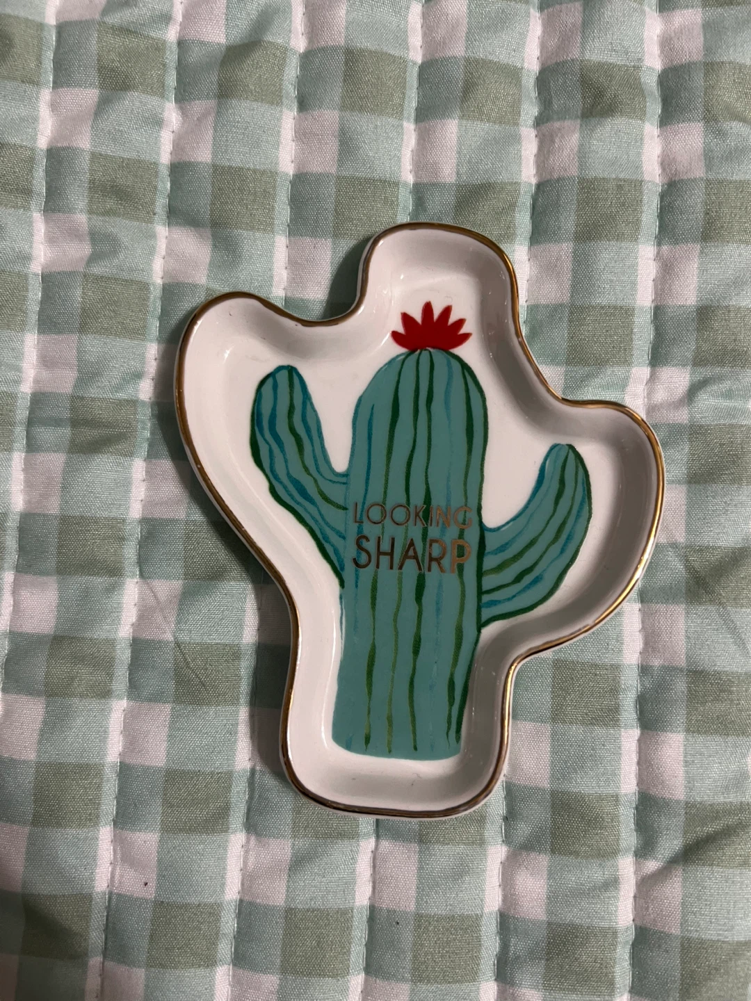 This cute Rosanna trinket dish is shaped like a cactus! It says "Looking Sharp" and is perfect for holding jewelry or other small items. It's hand wash only.