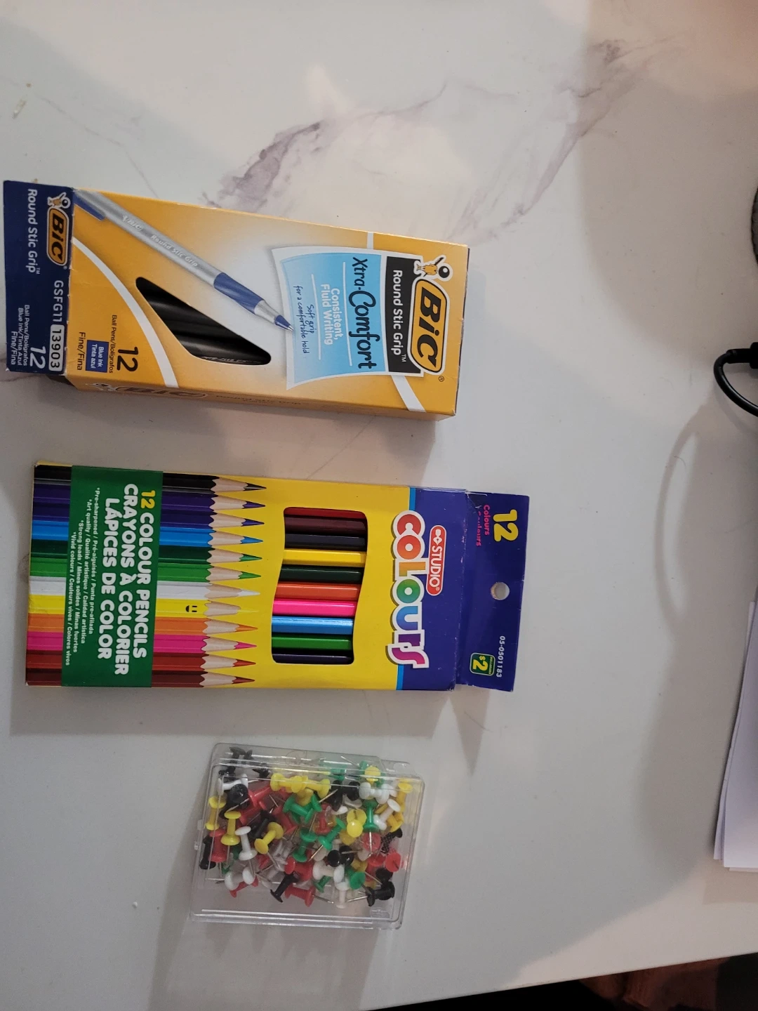 Selling a box of BIC Round Stic Grip pens and a box of Studio Colours pencils. Both boxes contain 11 pens. The pens have blue ink and a fine tip. Great for school or office use!