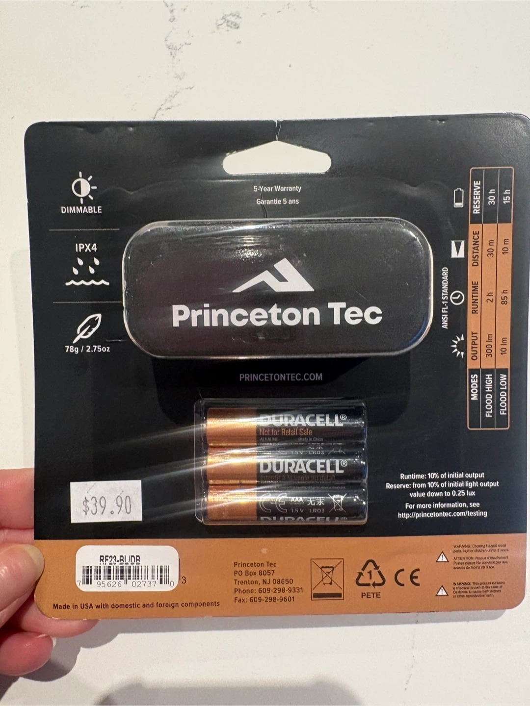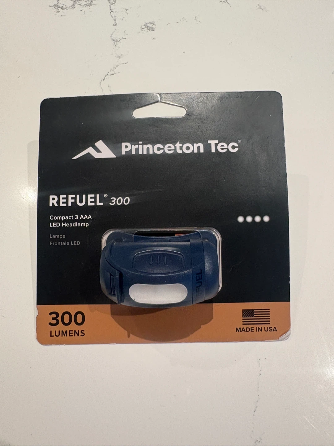 Brand new Princeton Tec Refuel 300 headlamp, still in its original packaging! This compact LED headlamp runs on 3 AAA batteries. It has a runtime of 2 hours on high output and up to 15 hours on low. The original retail price was $39.90.