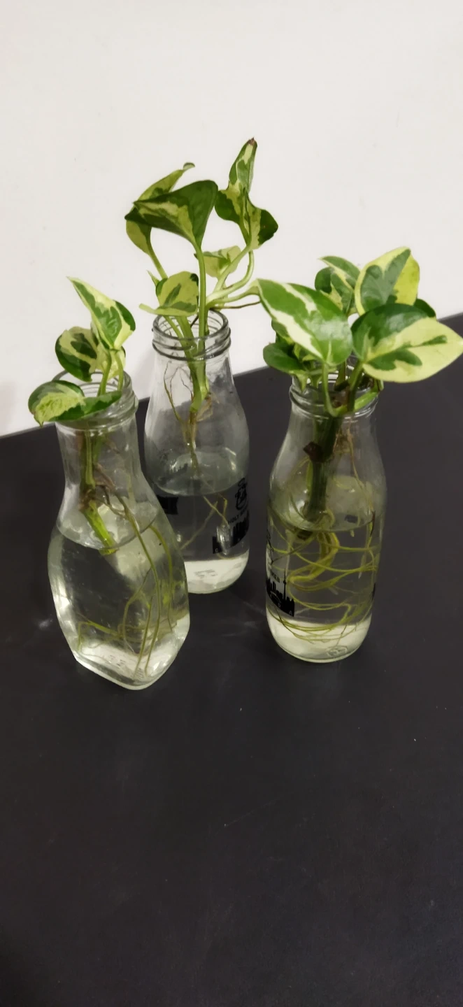 I have a set of three pothos plant cuttings.They're ready to add a touch of green to your space! These cuttings have already started to root, so they're ready to be potted or kept in water. Perfect for plant lovers!