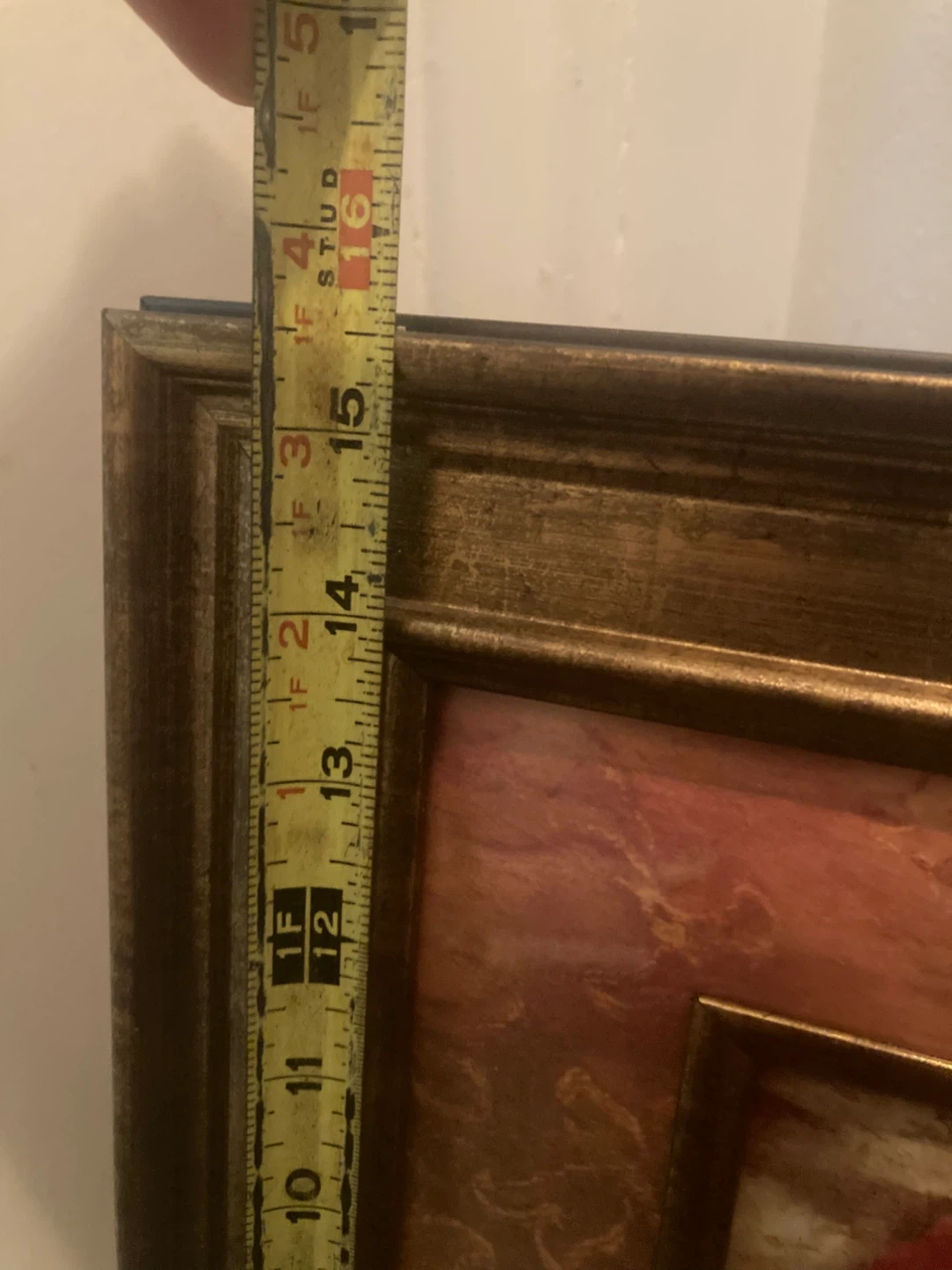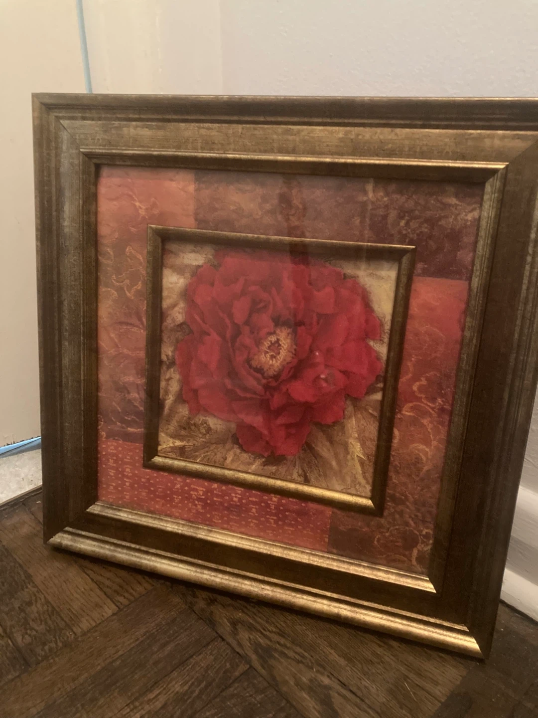 Lovely framed floral wall art! It's in great condition and ready to brighten up any room. The frame has a nice bronze-like finish, and the art itself features a beautiful red flower design. The frame measures approximately 16 inches.