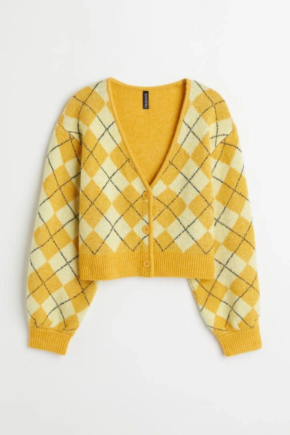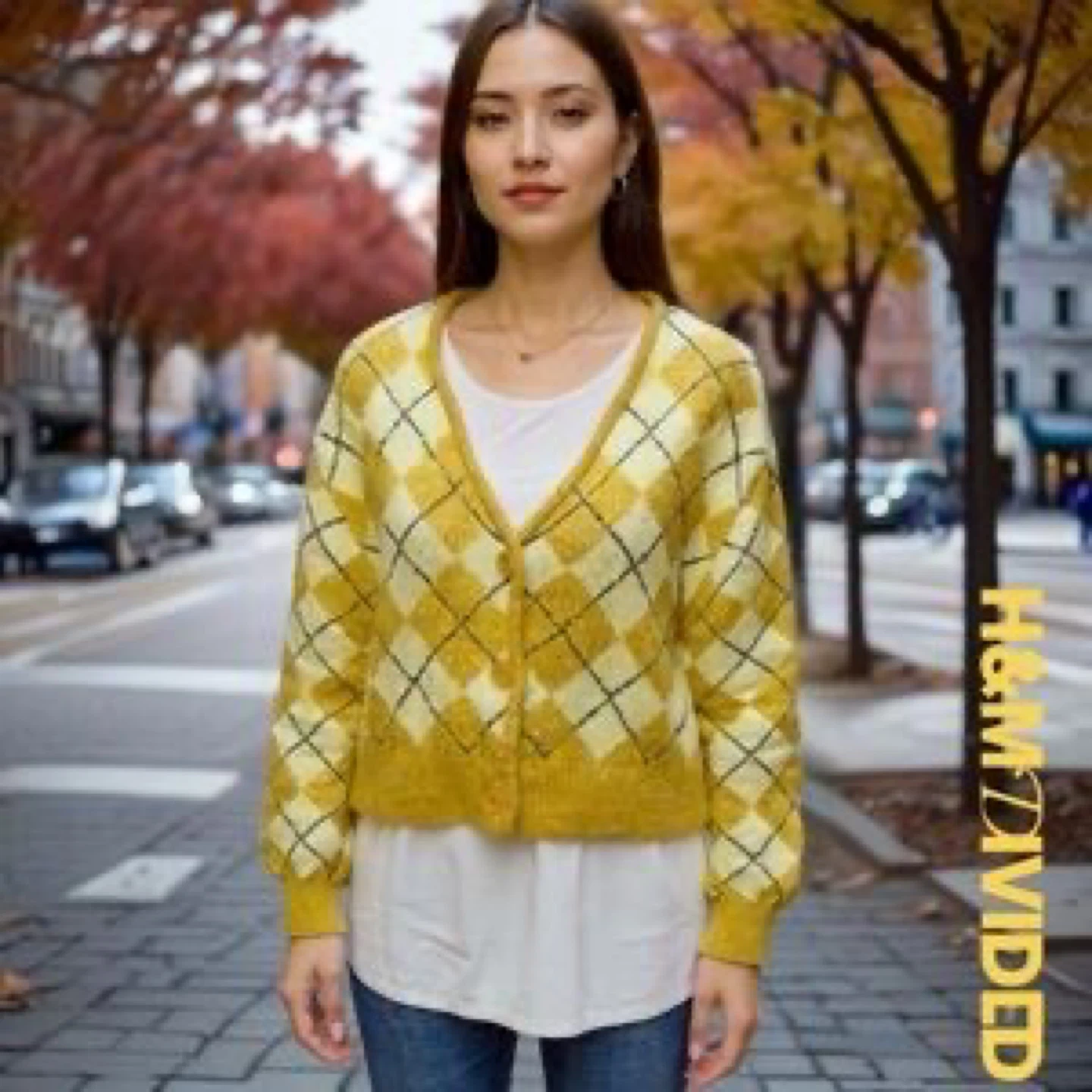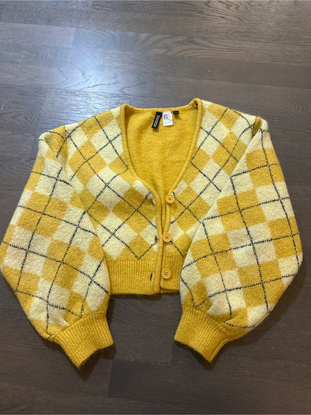 This is a cute yellow argyle cardigan from H&M Divided (size xs). It's in great condition and ready for a new owner! The material is soft and cozy, perfect for layering. It would look great with jeans or a skirt