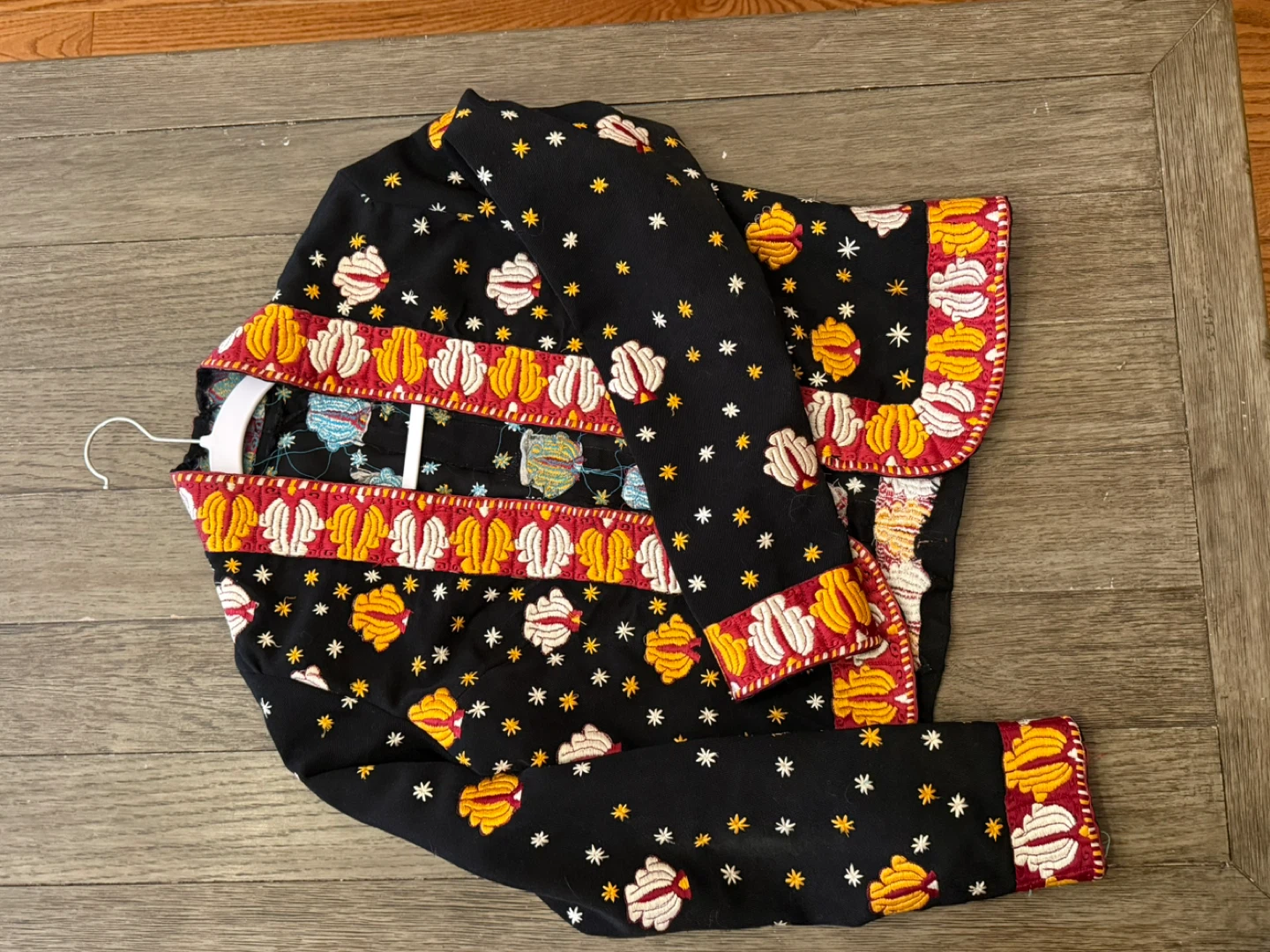 Here's a lovely embroidered black jacket! It has a unique design with colourful details. Perfect for adding a bit of flair to your wardrobe