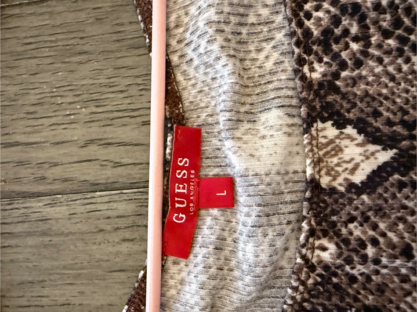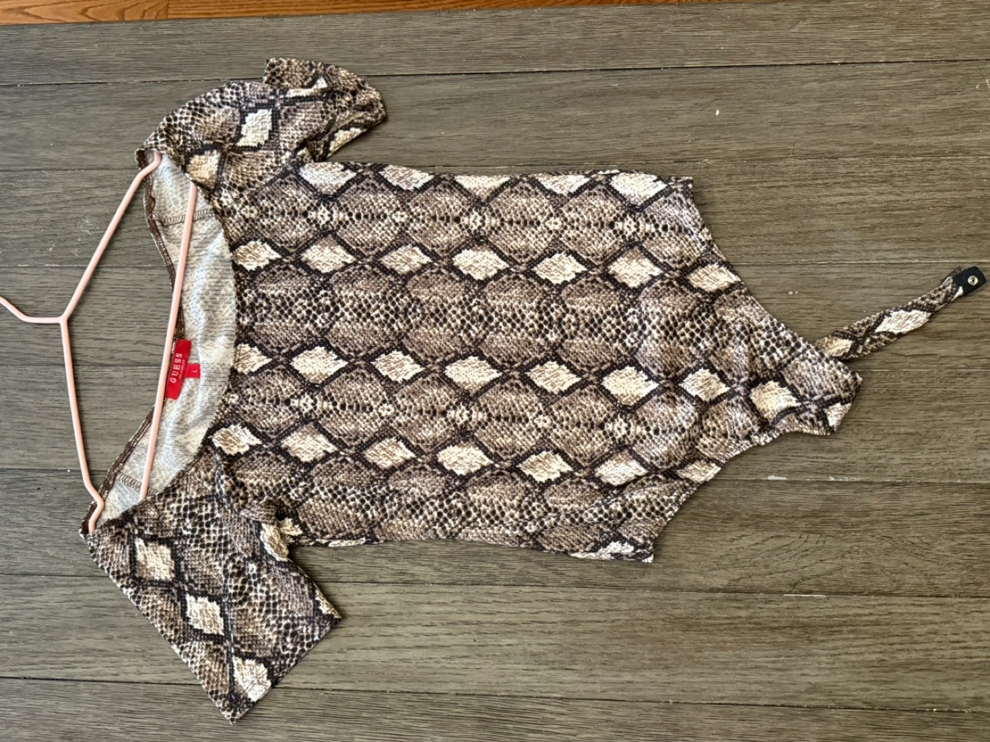 Snakeskin print bodysuit from Guess! It's a size large and in great condition. Perfect for a night out or to dress up any outfit. Stylish and comfortable!