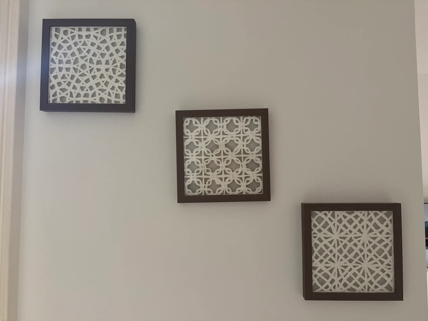 Selling a set of 3 decorative wall art pieces! They feature a geometric design within a dark brown frame. They'd be a great addition to any room!