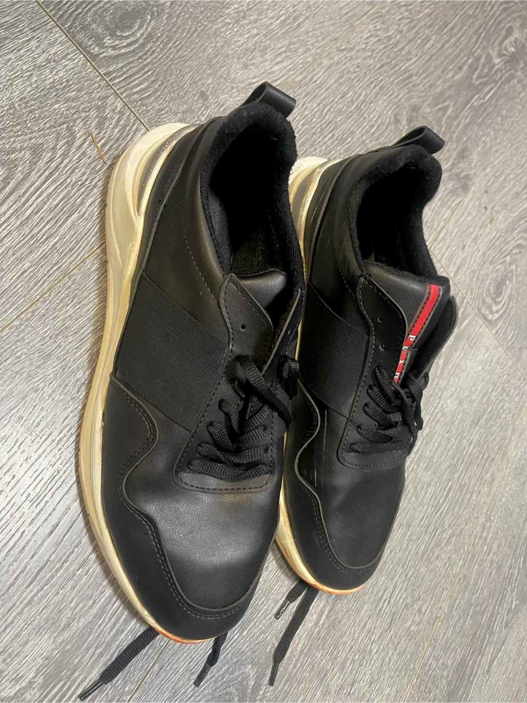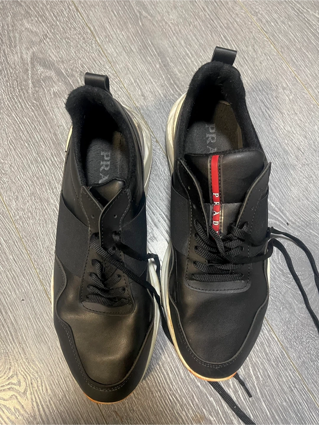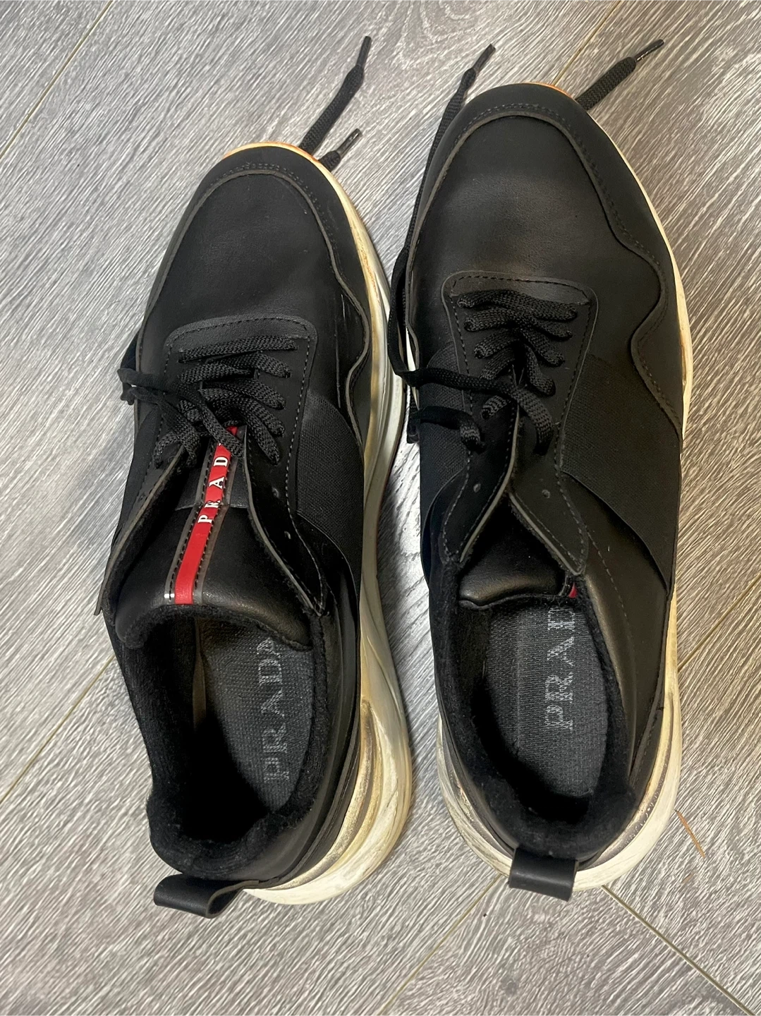 Selling a pair of Prada sneakers in black. They've been worn, as you can see in the photos, but still have lots of life left! Please take a look at the pictures for details on the condition.