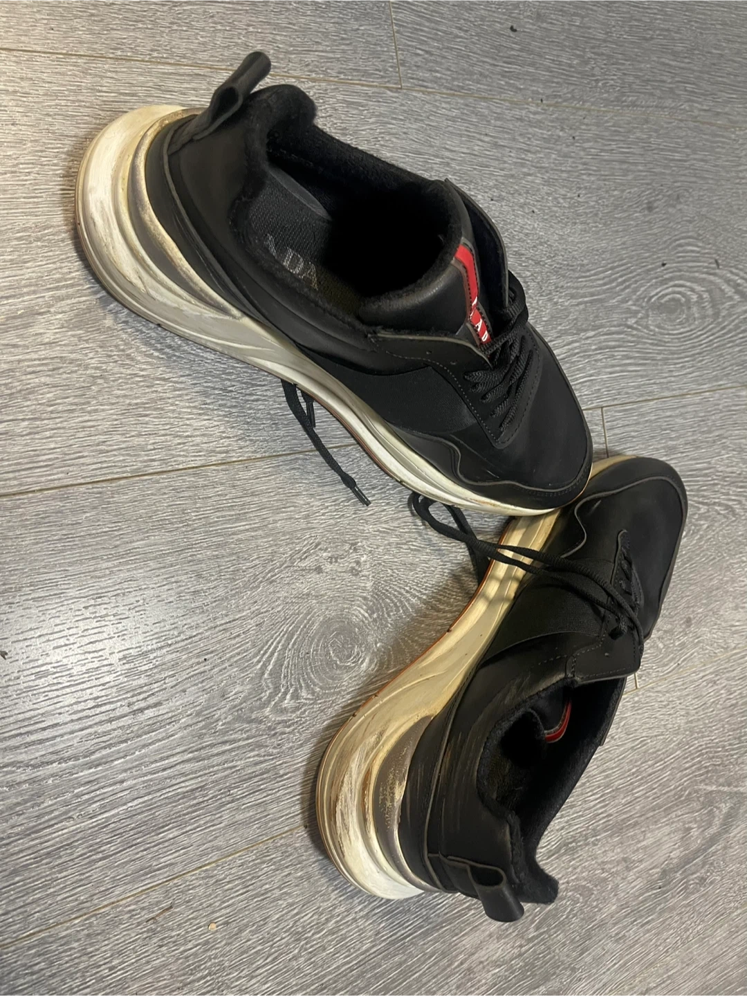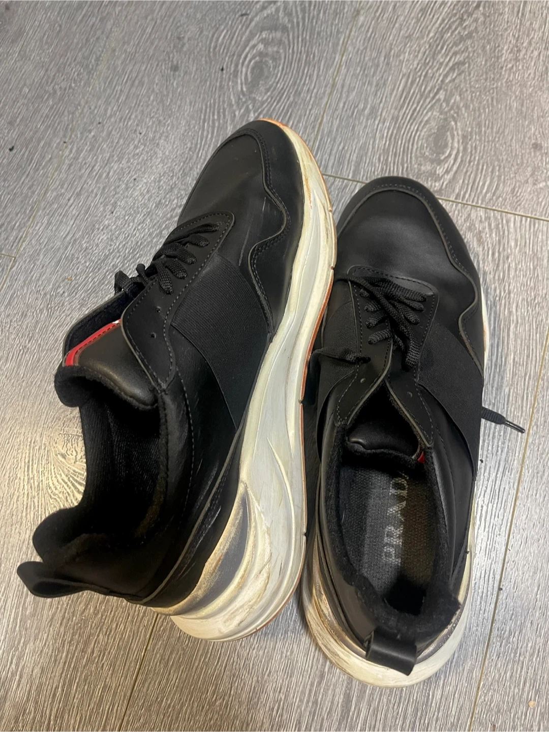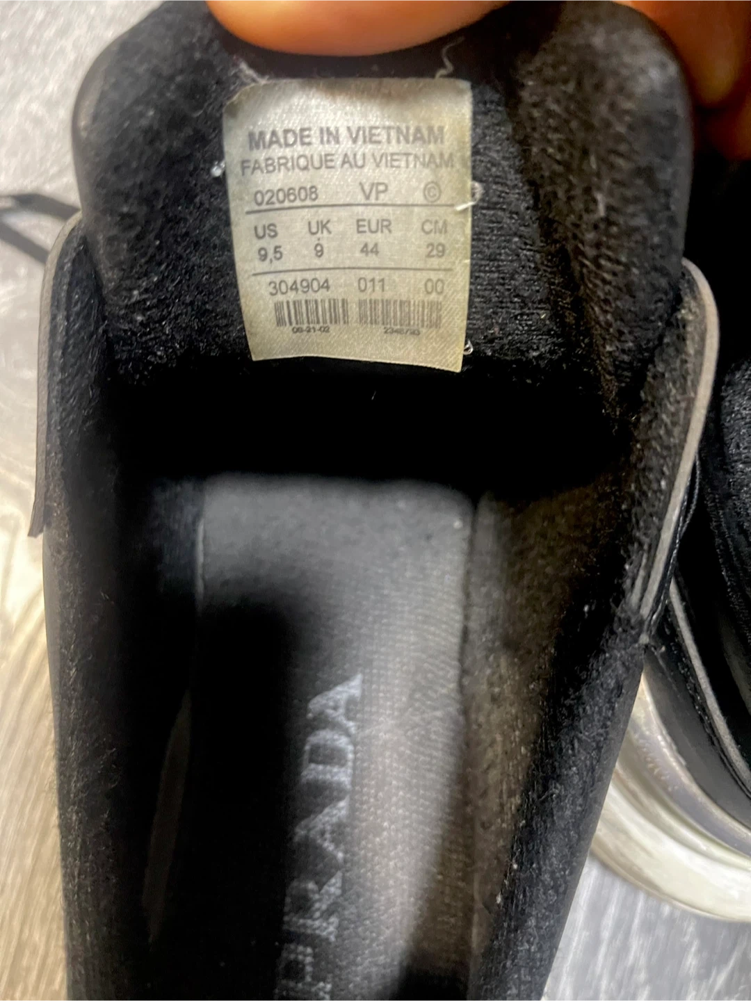 Selling a pair of Prada sneakers in black. They've been worn, as you can see in the photos, but still have lots of life left! Please take a look at the pictures for details on the condition.