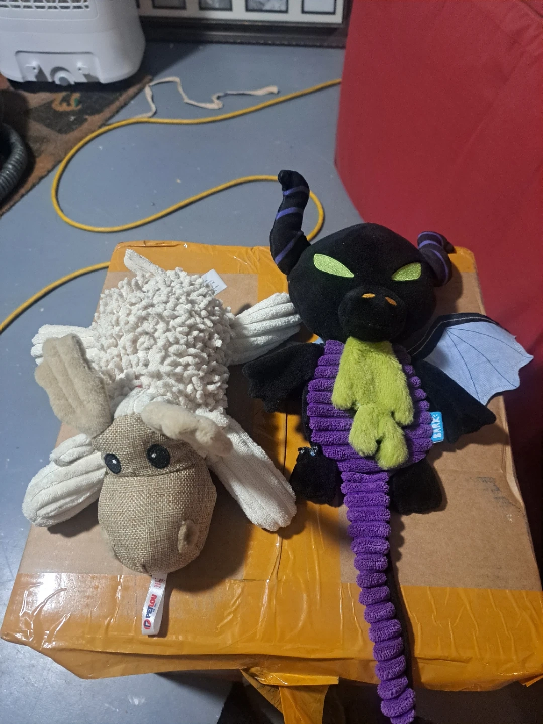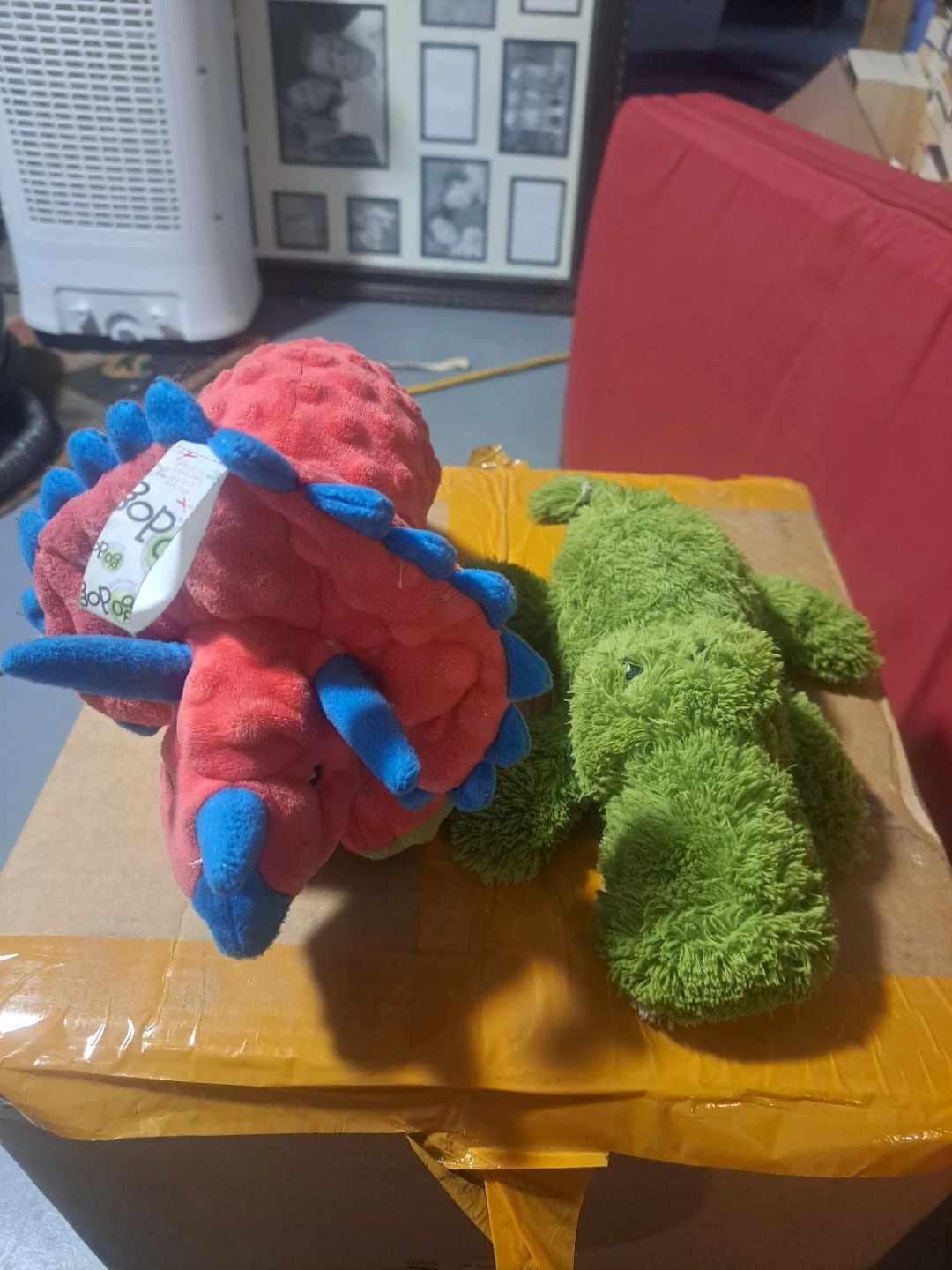 Selling a variety of plush dog toys! There's a Halloween witch hat, a coffee cup with a paw print, a red and blue dinosaur, a green alligator, a sheep, and a black and purple dragon. Great for keeping your furry friend entertained!