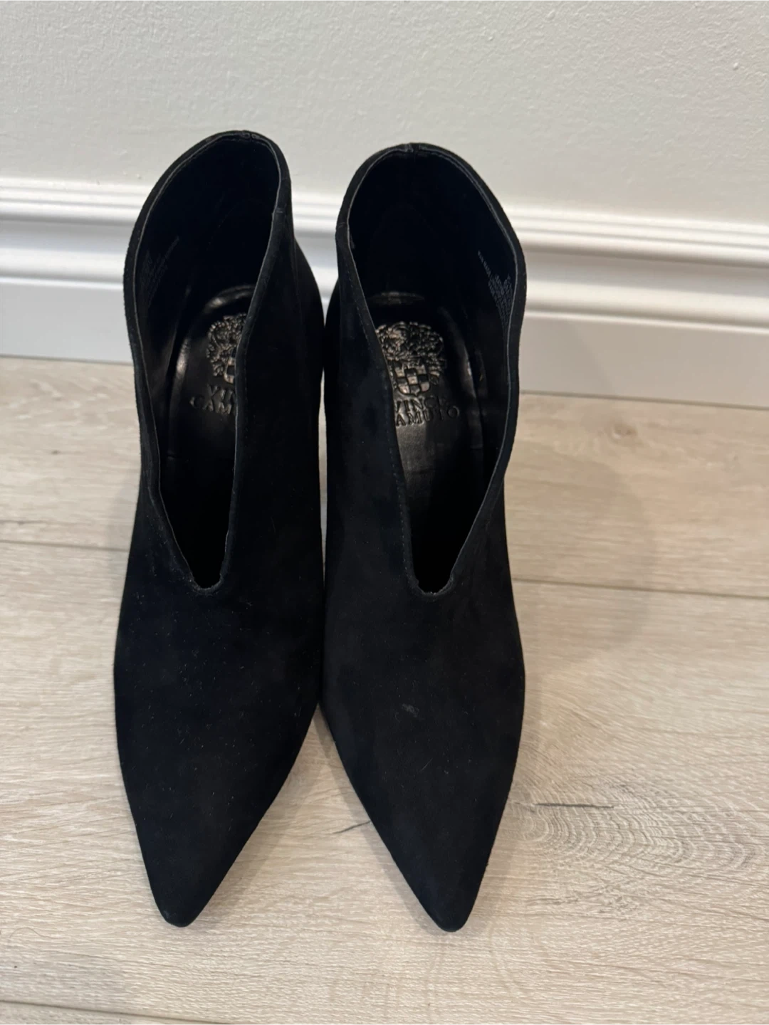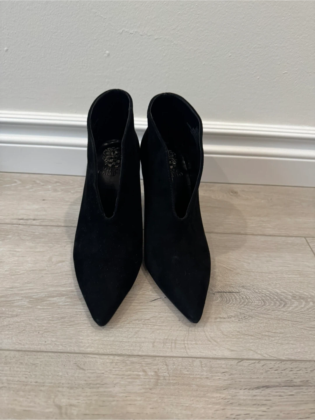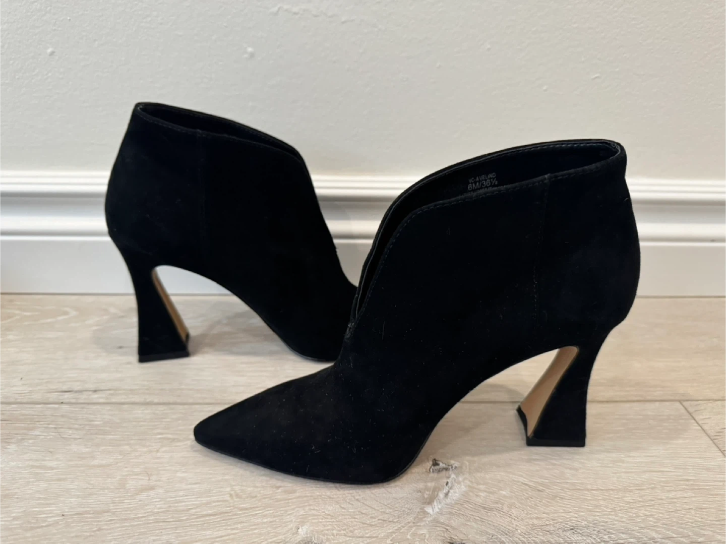Selling a pair of Vince Camuto black suede booties in size 6. They are in great condition and have a unique heel design that adds a touch of style to any outfit