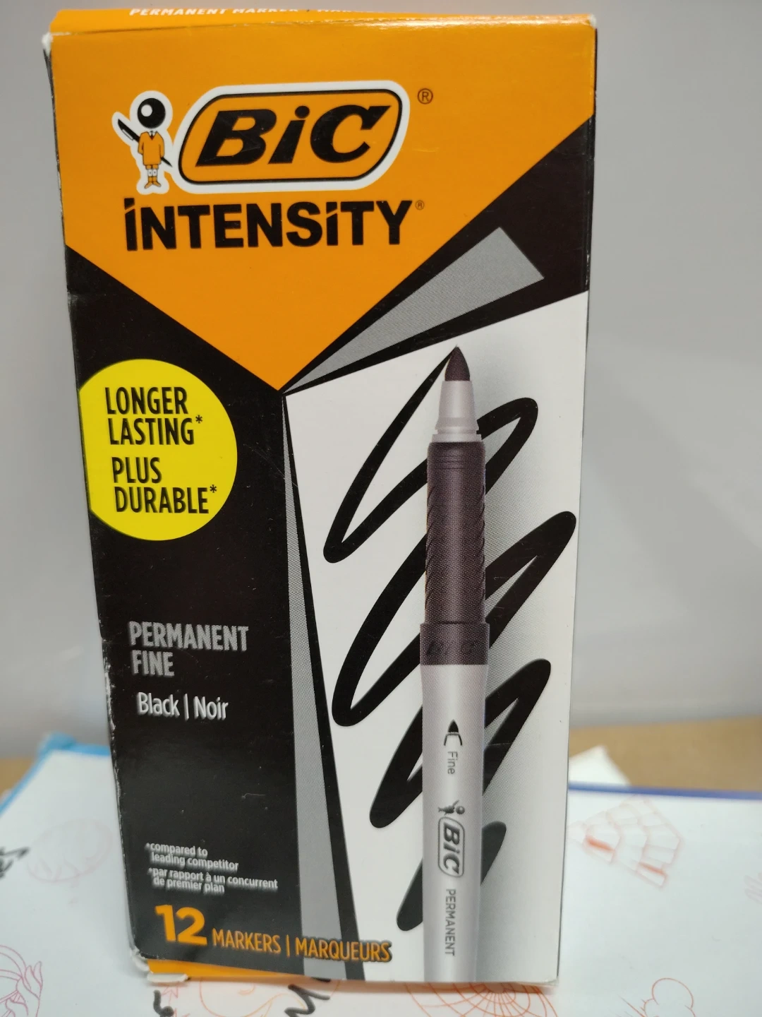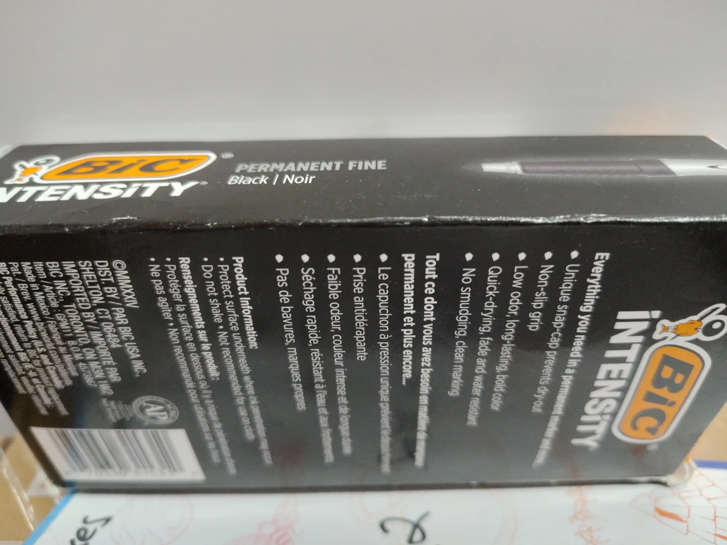 Selling a box of BIC Intensity permanent fine point markers in black! The box contains 12 markers. They're known for their quick-drying, bold color and non-smudging capabilities. Perfect for all your marking needs. 22 boxes are in stock get yours before they run out!