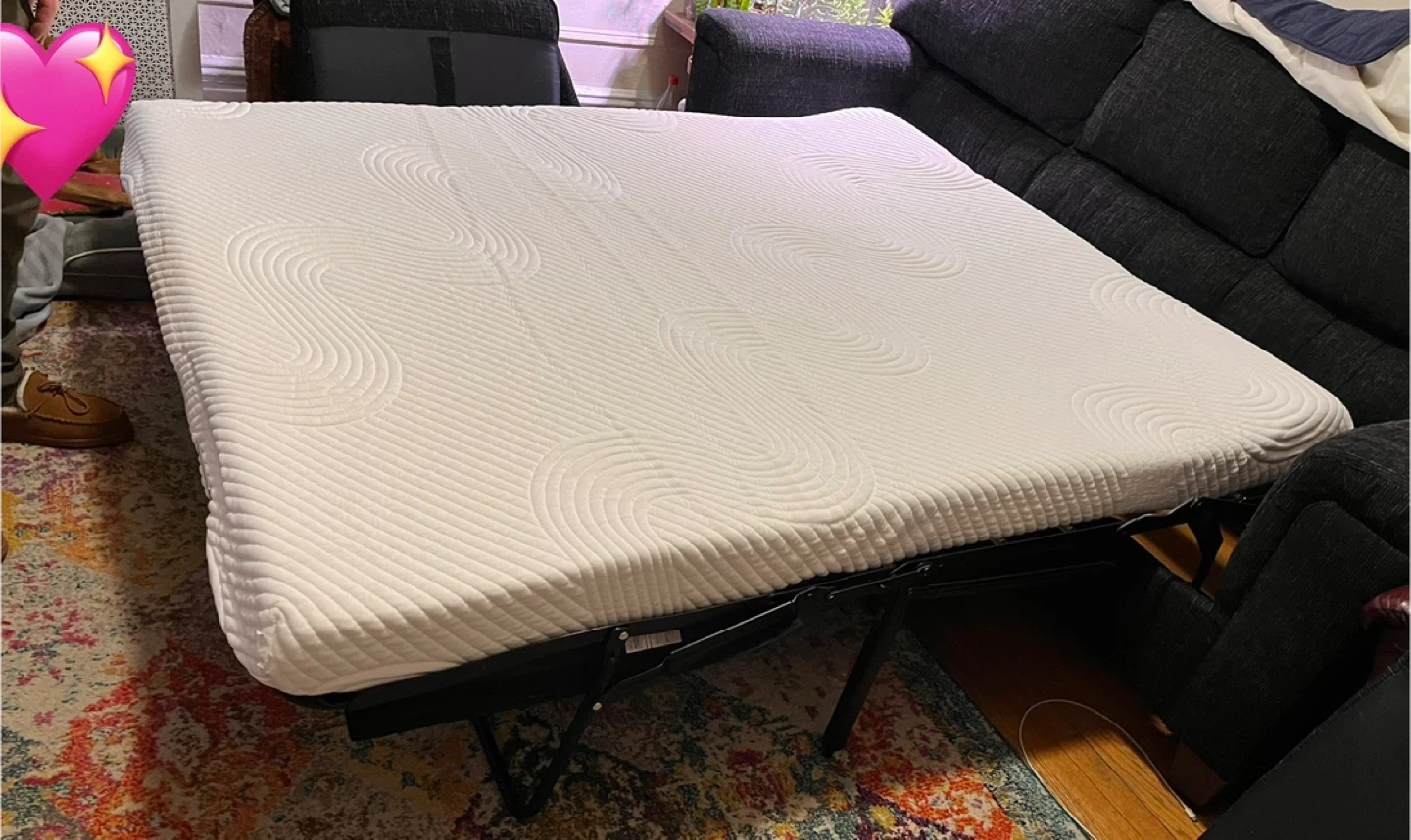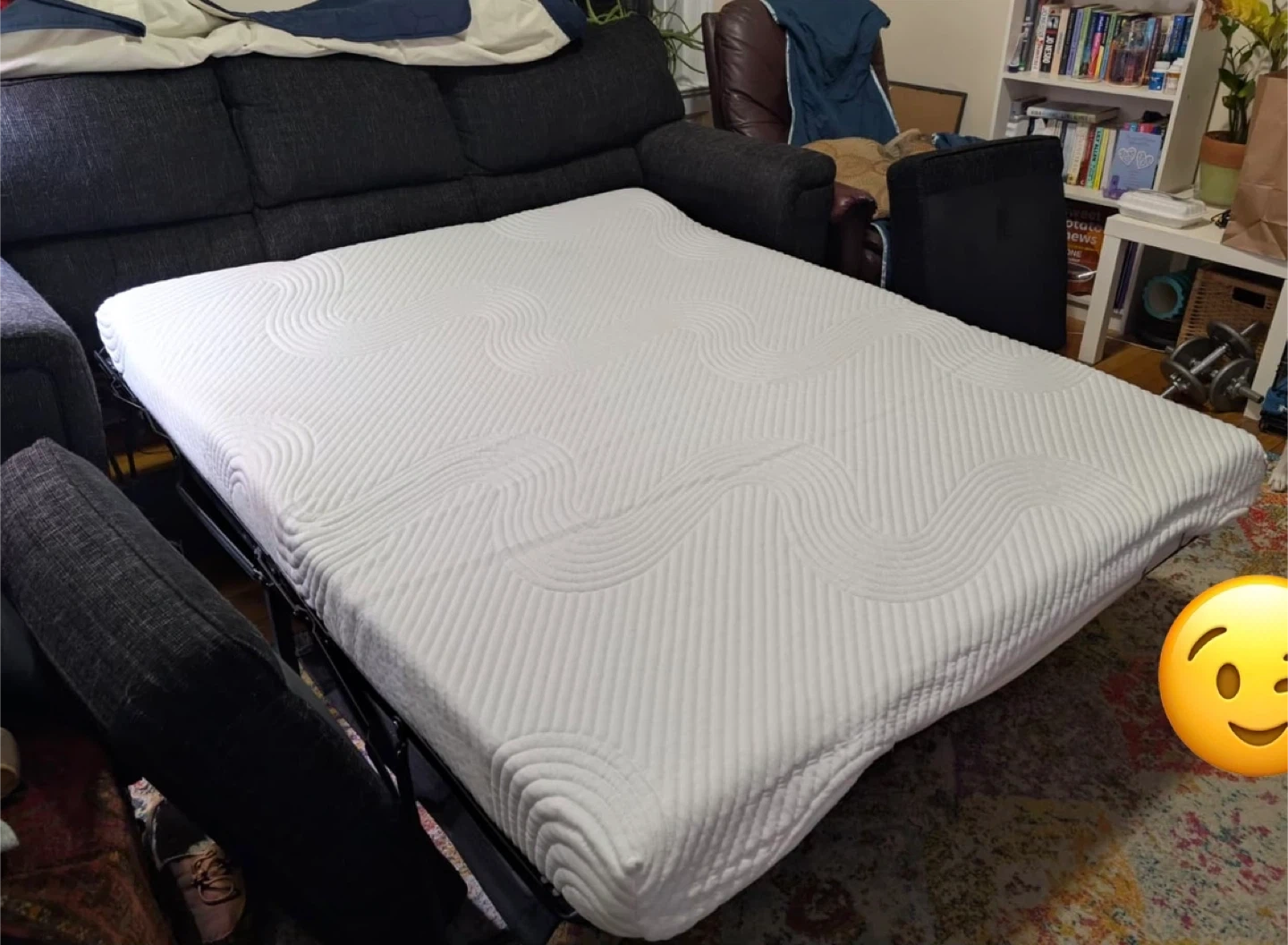 Selling a comfortable three-seat sofa in dark grey. 6 years old, very well looked after, we always used cover. It's in good condition, no rips or stains! Removable cushions for easy cleaning. The couch is 88 inches long and it has queen sized pull out bed with 4 inch memory foam. We used the mattrace 3x for a total of 3 weeks.