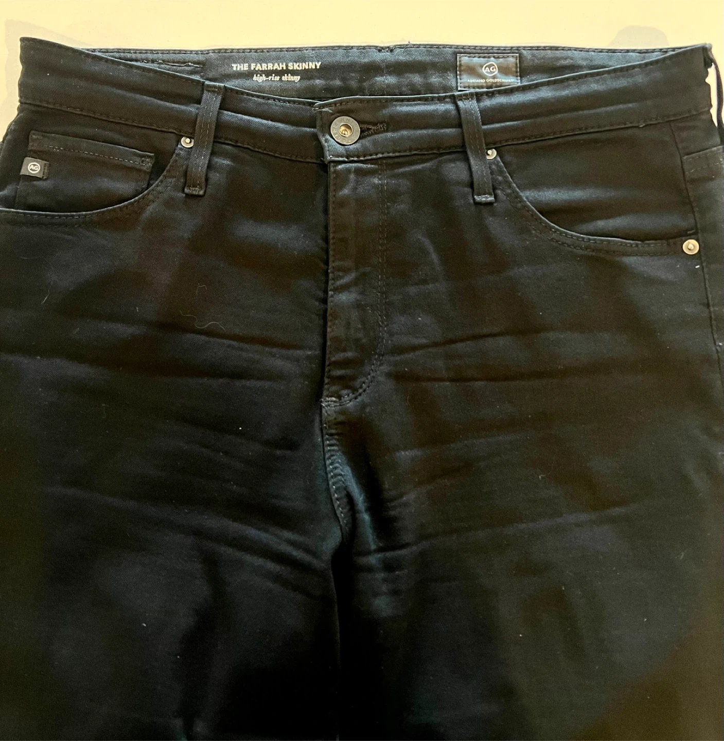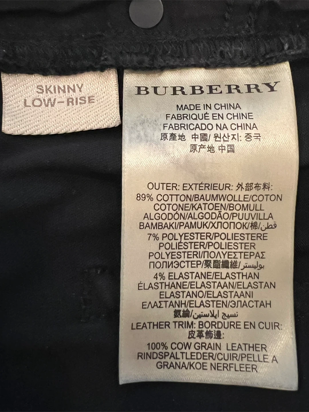 Selling a pair of Burberry Brit black skinny low-rise jeans. They are a size W31. The outer material is 89% cotton, 7% polyester, and 4% elastane, with a leather trim of 100% cow grain leather.