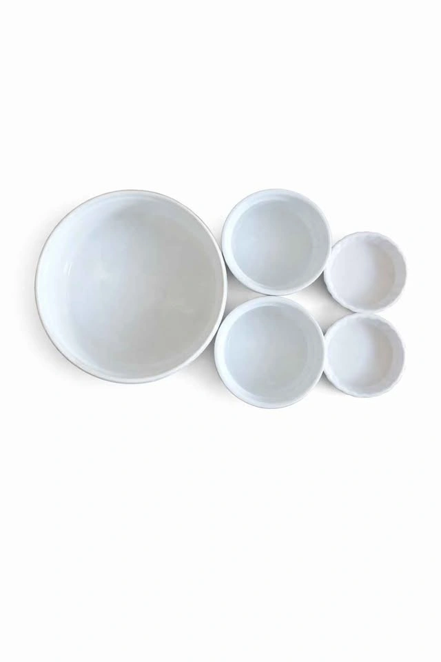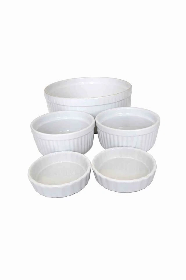 Set of 5 white porcelain ramekins in assorted sizes. Classic fluted design, perfect for baking, prep, or serving.