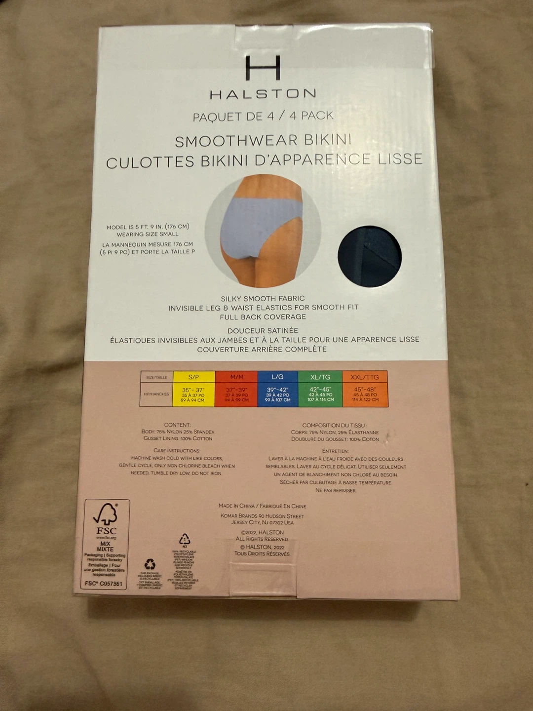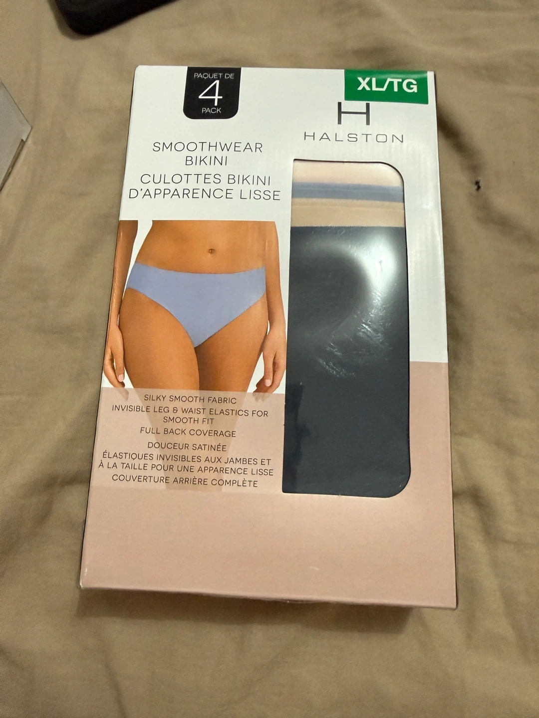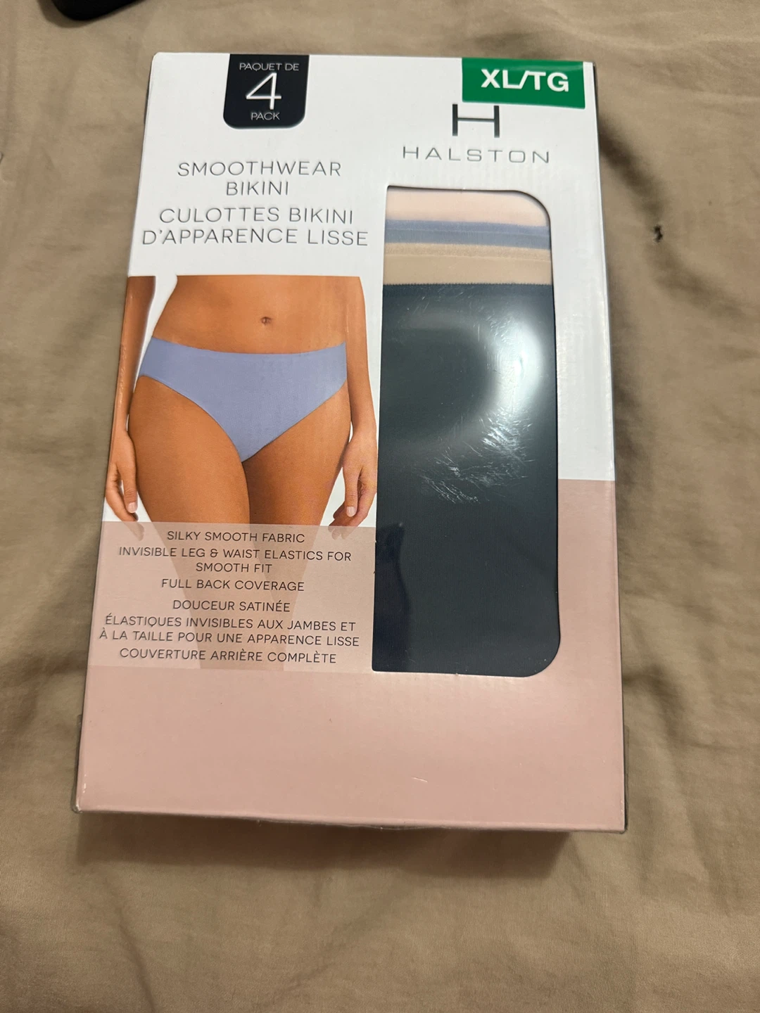 Selling a new, in-box 4-pack of Halston Smoothwear Bikini bottoms in size XL/TG. These offer silky smooth fabric and full back coverage. The material is a mix of nylon, spandex, and cotton. Machine washable in gentle cycle, non-chlorine bleach only