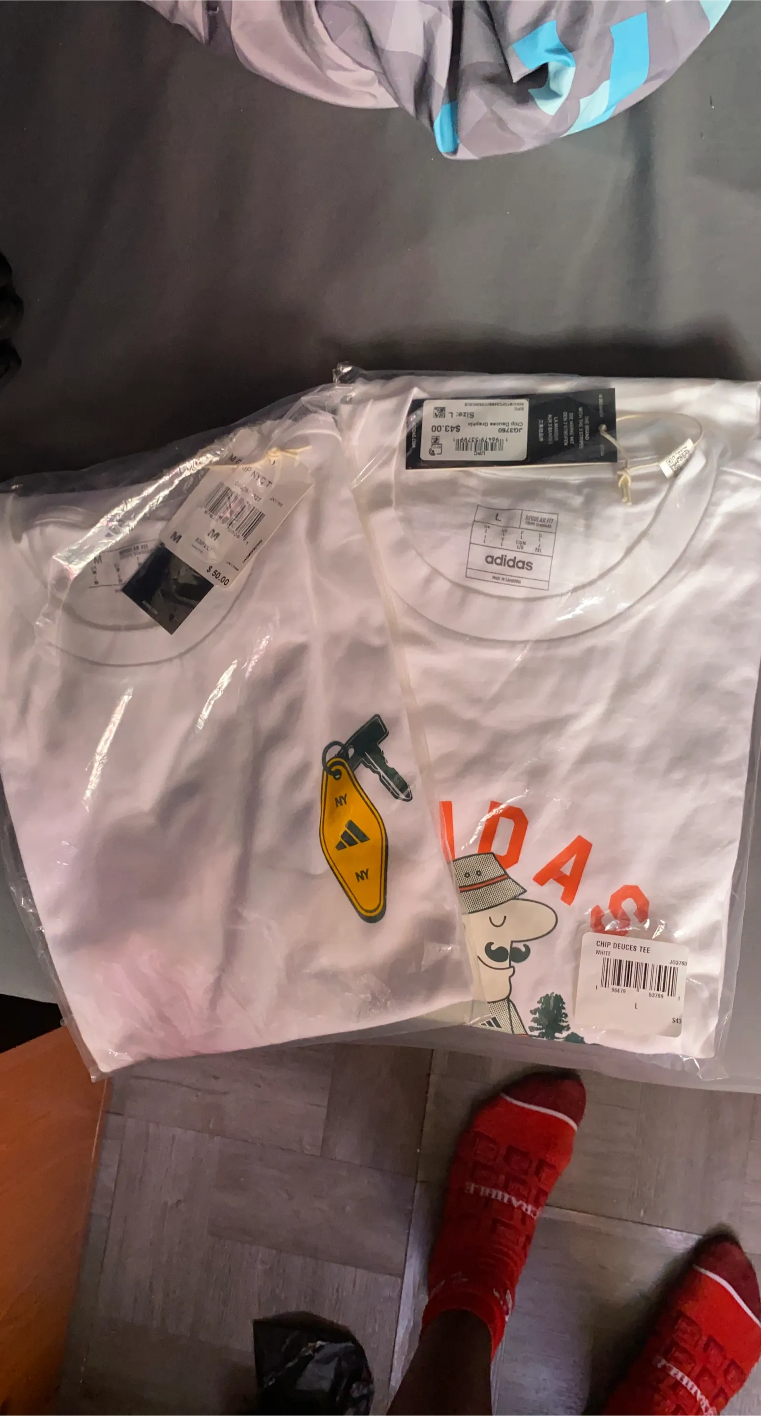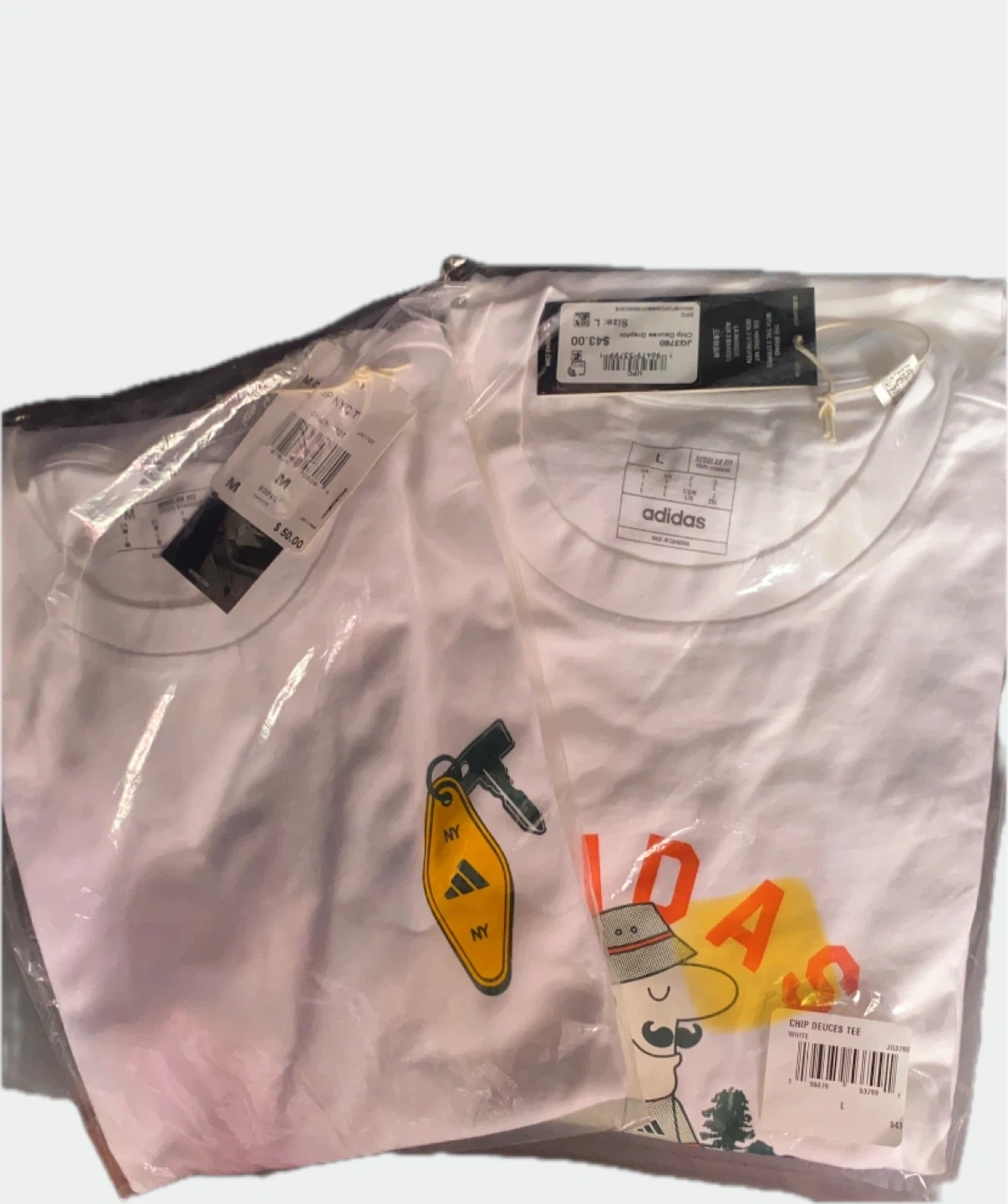 I have a brand new Adidas Chip Deuces Graphic Tee in white, size L/M. It's still in the original packaging! One tee features a fun graphic, and the other has a cool Adidas key design. Originally bought for $43 and $50.