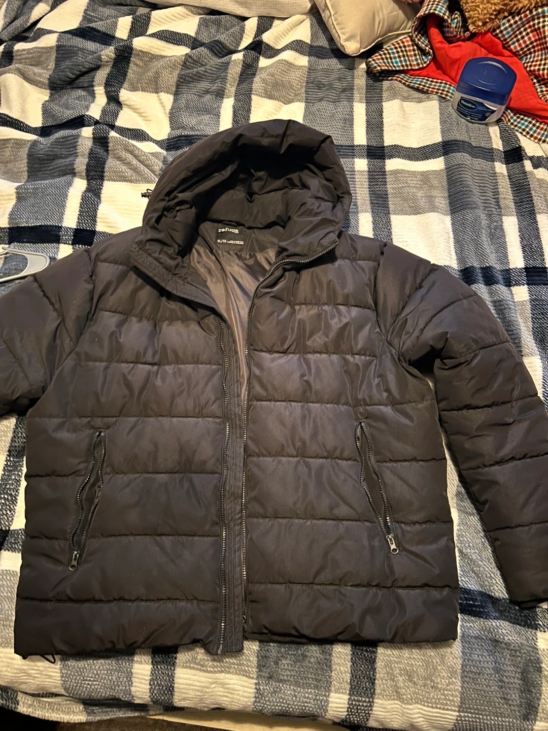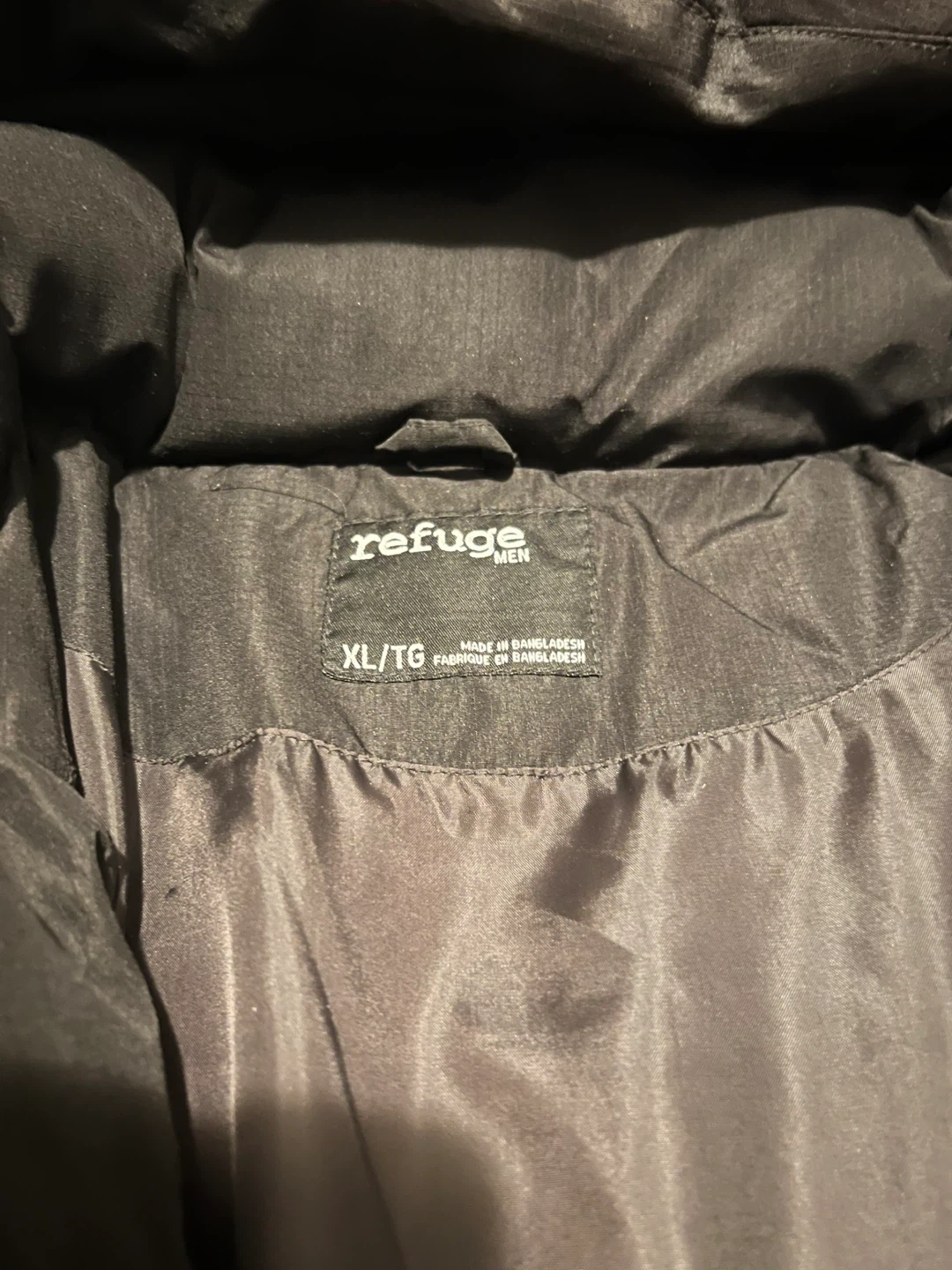 Here's a Refuge men's puffer black jacket in size XL/TG. It's a great jacket for the colder weather.