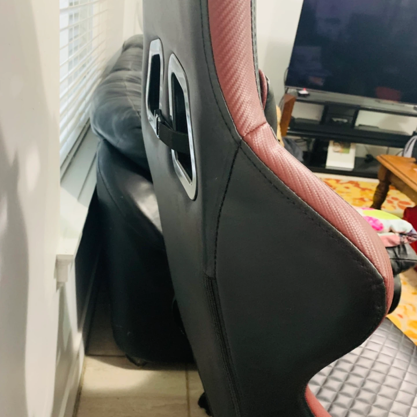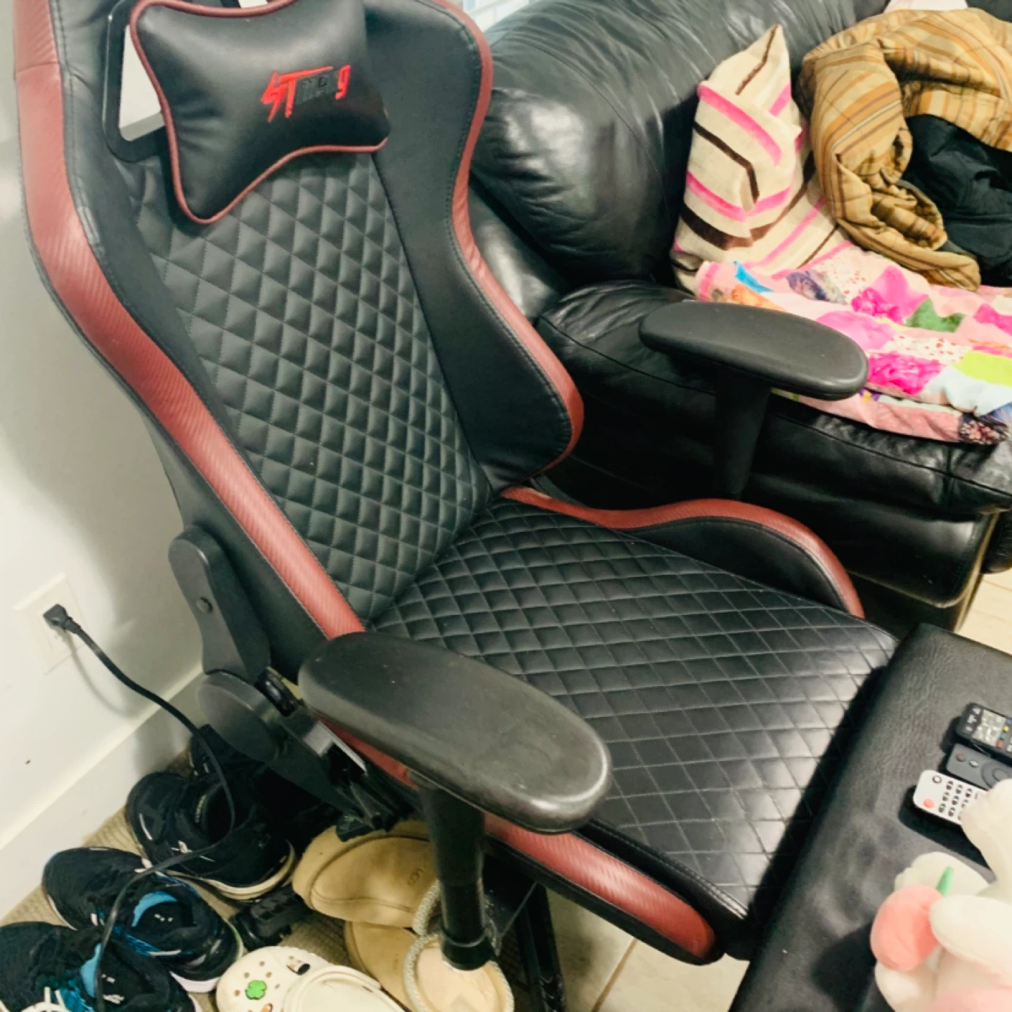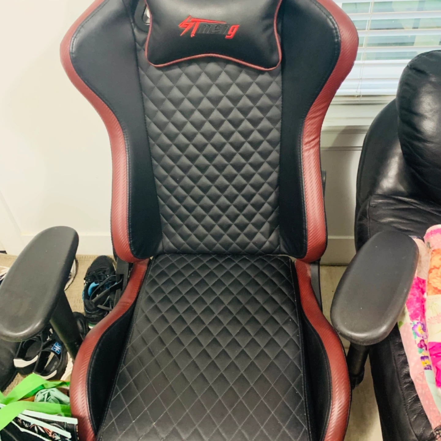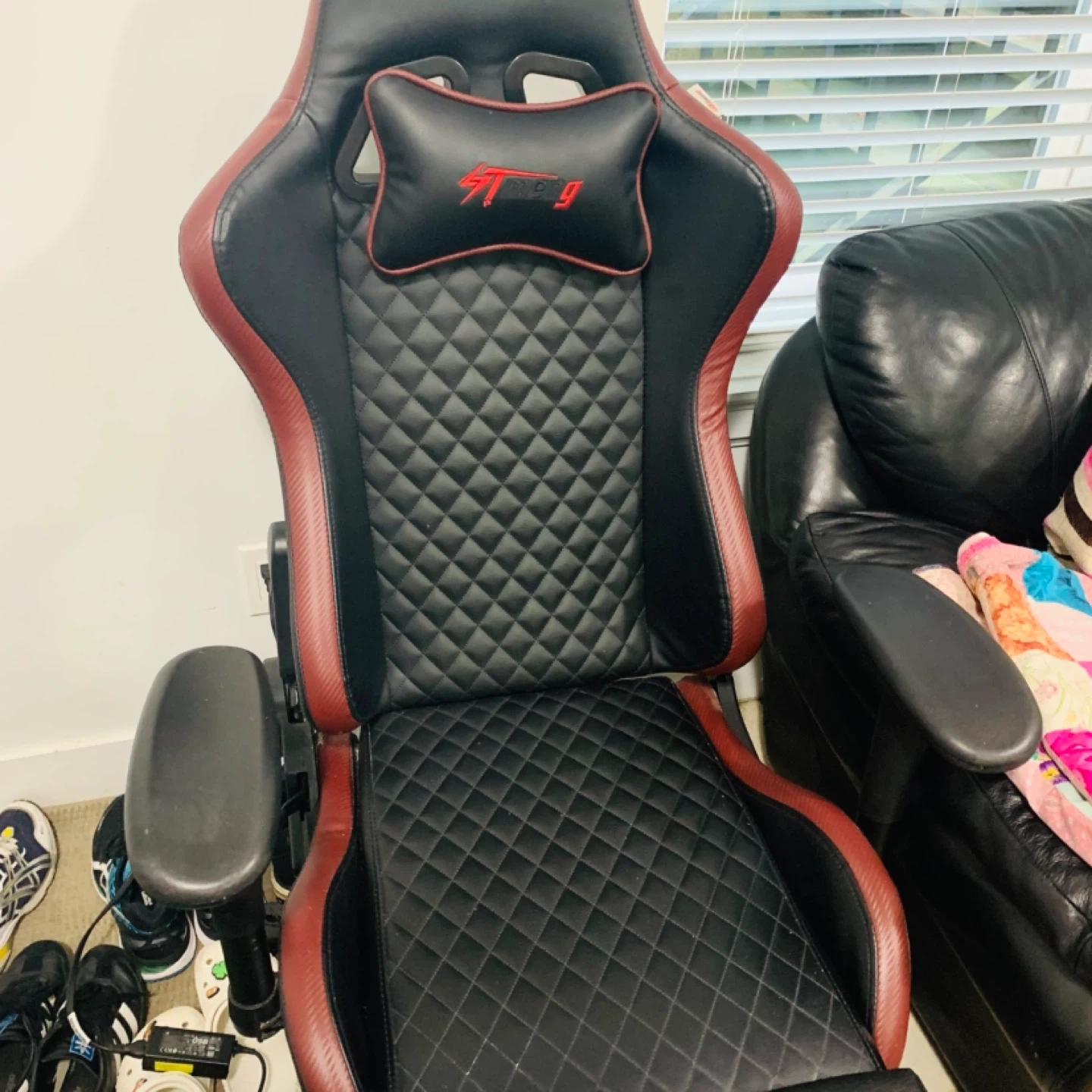 Selling a black and red ST Racing gaming chair. It features a quilted design on the seat and back, and comes with a headrest pillow for extra comfort. Great for long gaming sessions or working from home!