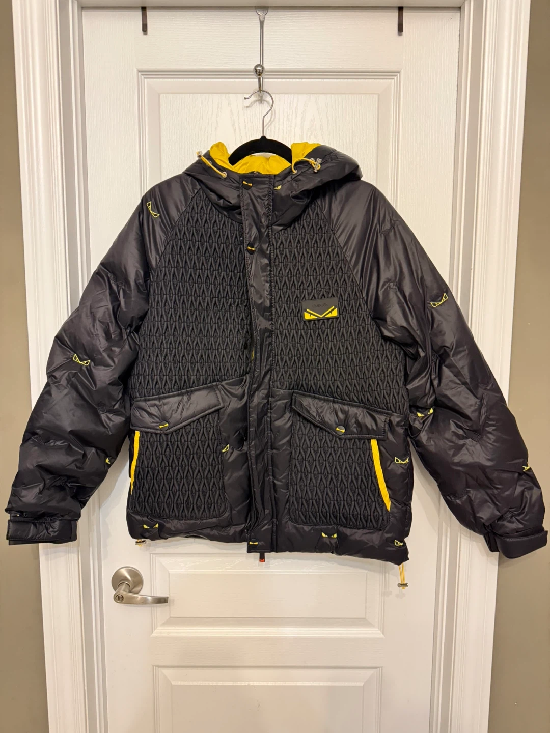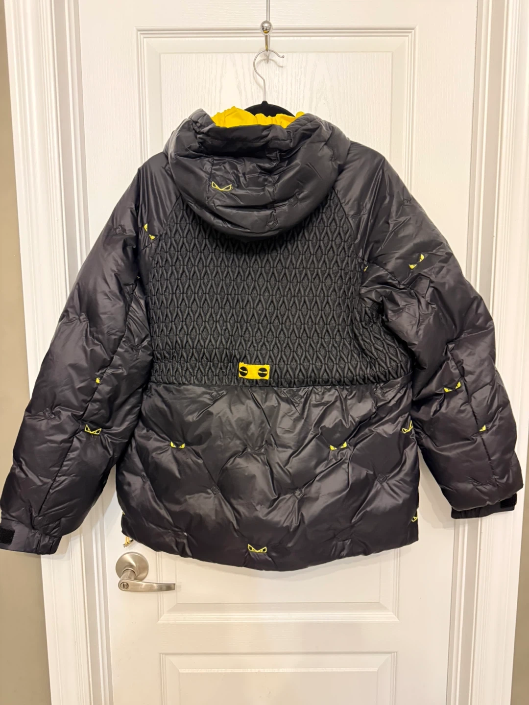Selling a brand new black padded down jacket and ready to keep you warm! The jacket features a unique design with yellow accents and the iconic eyes motif. A stylish and functional piece for the colder months