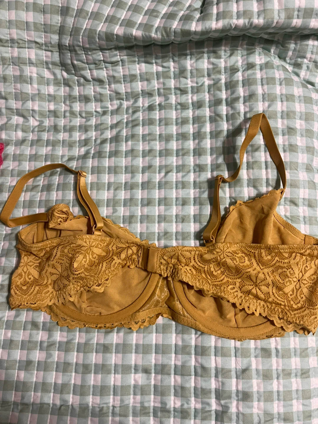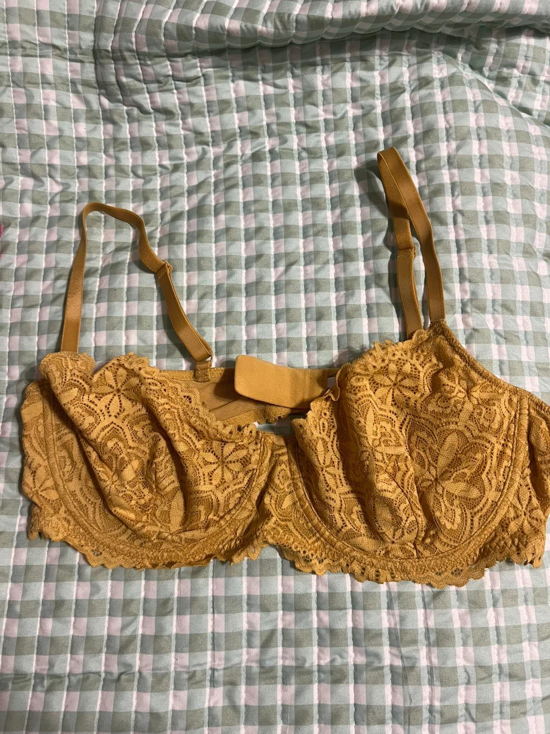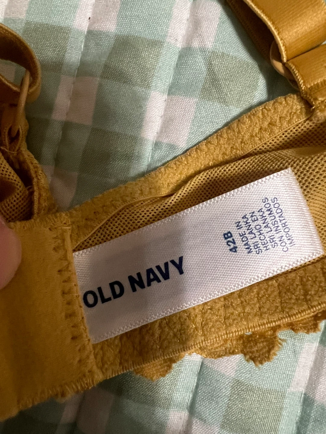 Selling an XL Old Navy bra in size 42B. It's a beautiful mustard yellow color and features a lace design. Perfect for everyday wear and for adding a touch of color to your lingerie collection!